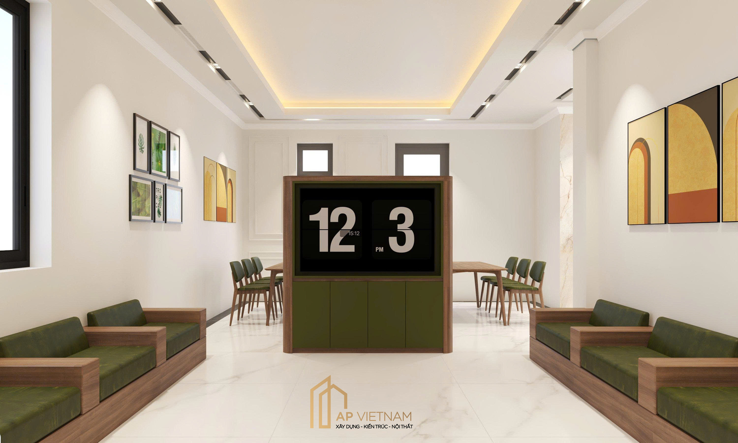 - Nhận diện thương hiệu được tích hợp hài hòa, tăng độ chuyên nghiệp cho tổng thể: sử dụng tông xanh điểm xuyết trên nội thất và sơn tường màu be tạo cảm giác ấm áp, thân thiện và tươi mới.