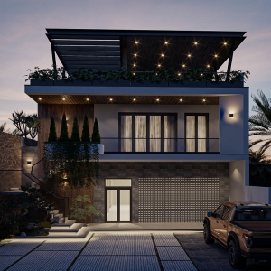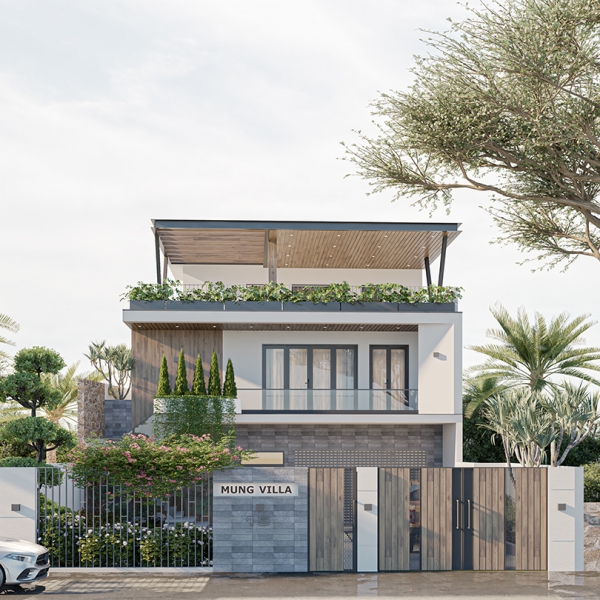 + Phong cách thiết kế: Kiến trúc hiện đại, thanh thoát, sử dụng hình khối rõ ràng và tối giản chi tiết trang trí. Mặt tiền được phối hợp hài hòa giữa các vật liệu như kính, sơn giả đá, gạch ốp tạo điểm nhấn thẩm mỹ nổi bật.