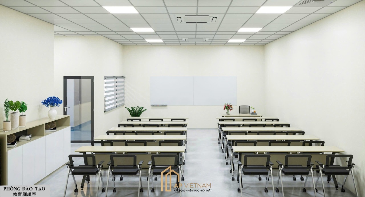 Khu vực phòng đào tạo được bố trí hệ bàn ghế linh hoạt, không gian rộng rãi, dễ quan sát. Sự bố trí khoa học giúp tối ưu khả năng tương tác giữa giảng viên và học viên.
