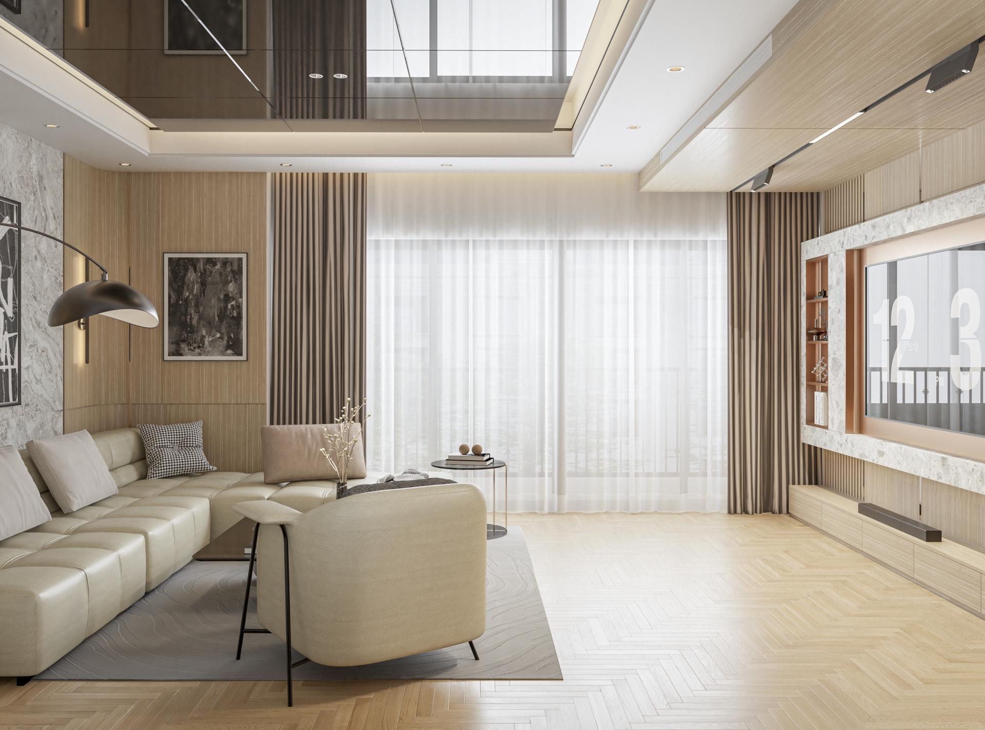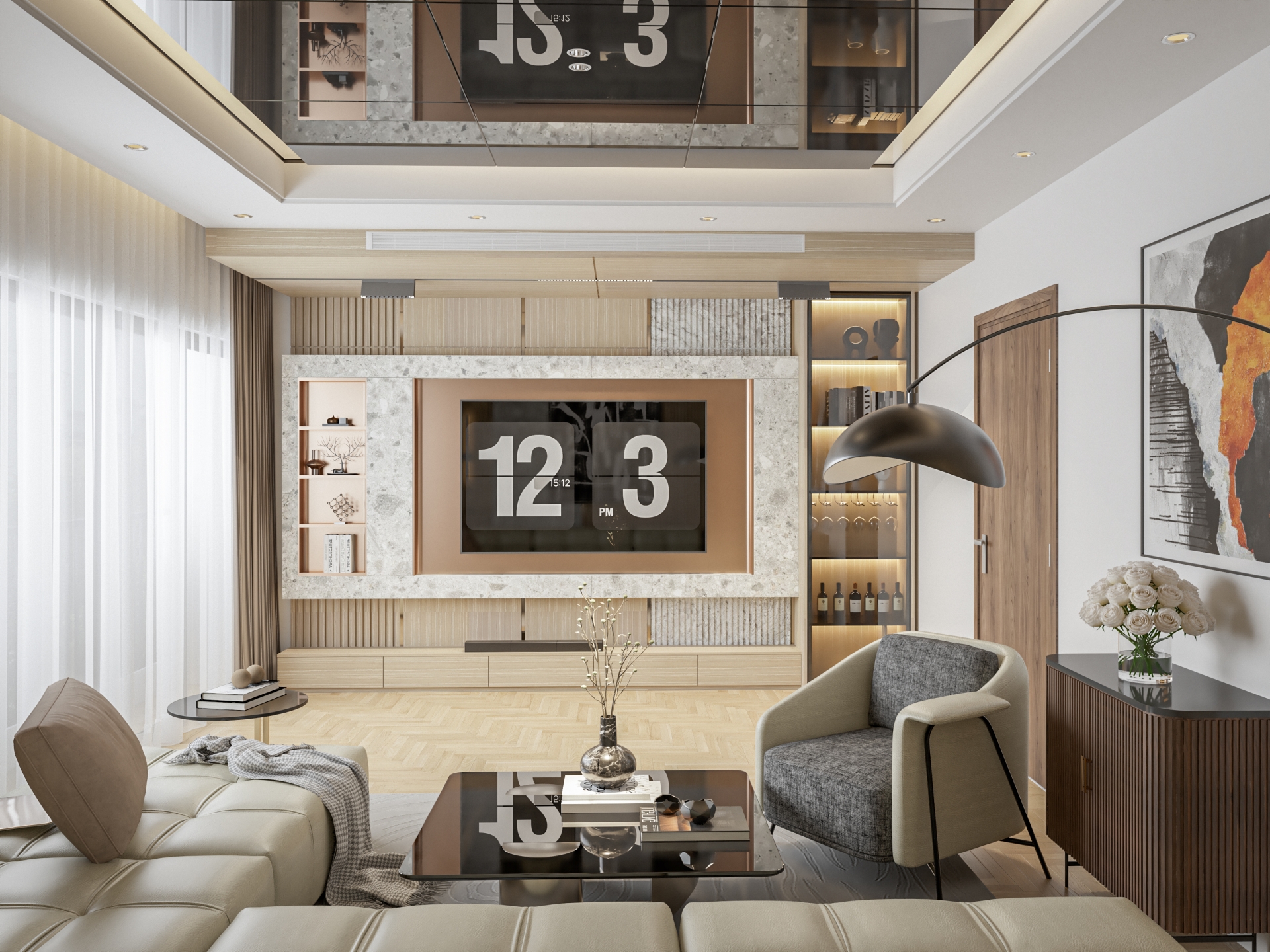 - Sử dụng gam màu sắc trung tính thiên tone màu sáng, cùng với điểm nhấn là trần tráng gương và ánh sáng đèn led âm trần tạo cảm giác rộng và sáng cho toàn thể căn phòng.