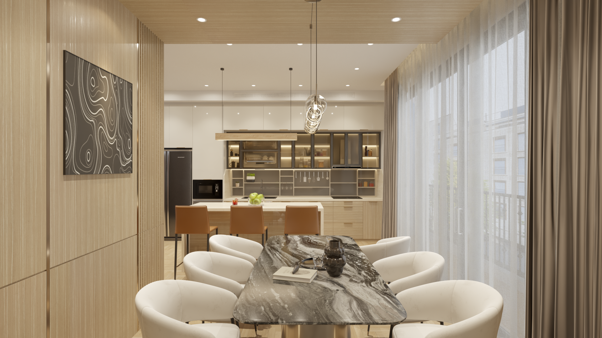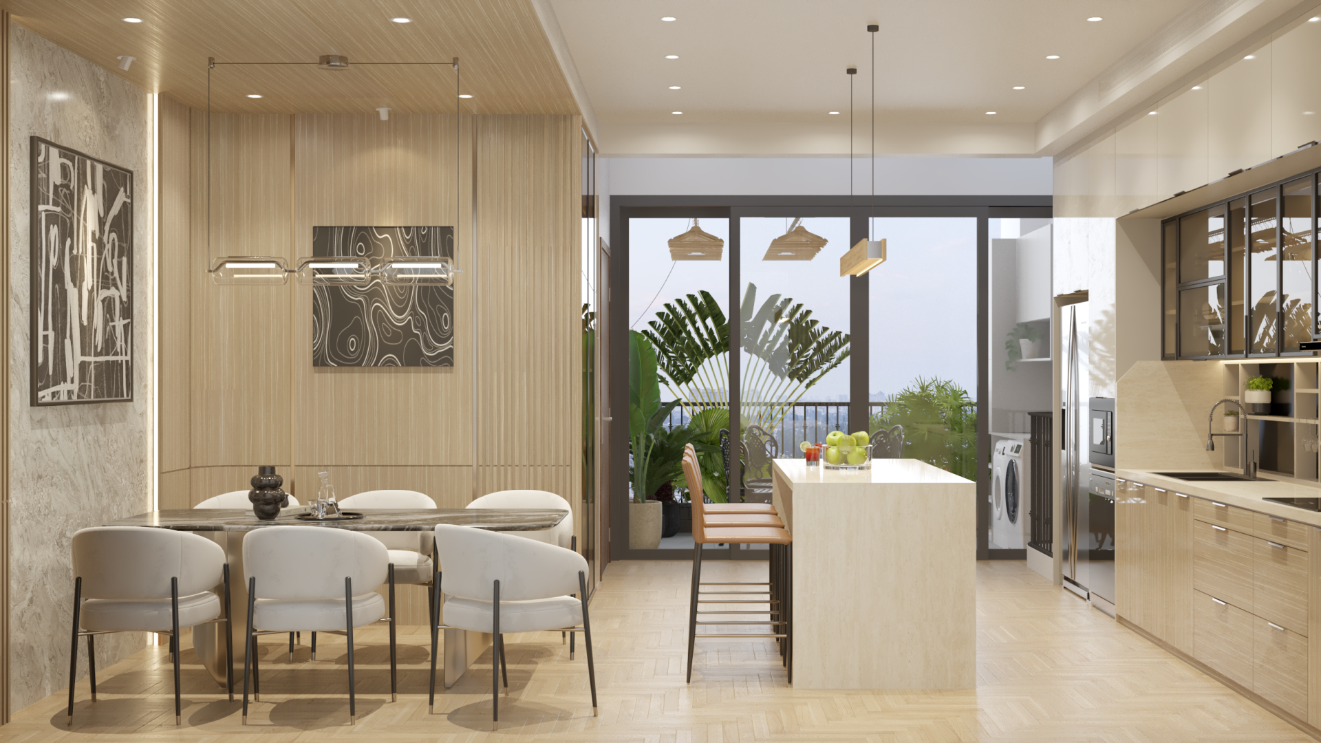 - Thiết kế công năng đảo bếp có bố trí thêm ghế ngồi, gia tăng công năng như một không gian "chill" buổi sáng hoặc tiệc nhẹ 2-3 người,...