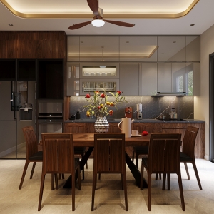 Chúng tôi sử dụng chất liệu gỗ tự nhiên kết hợp đá granite và kính cường lực, đi cùng tông màu trung tính ấm áp, tạo nên tổng thể không gian vừa hiện đại vừa gần gũi, phù hợp với sở thích và gu thẩm mỹ của gia chủ.