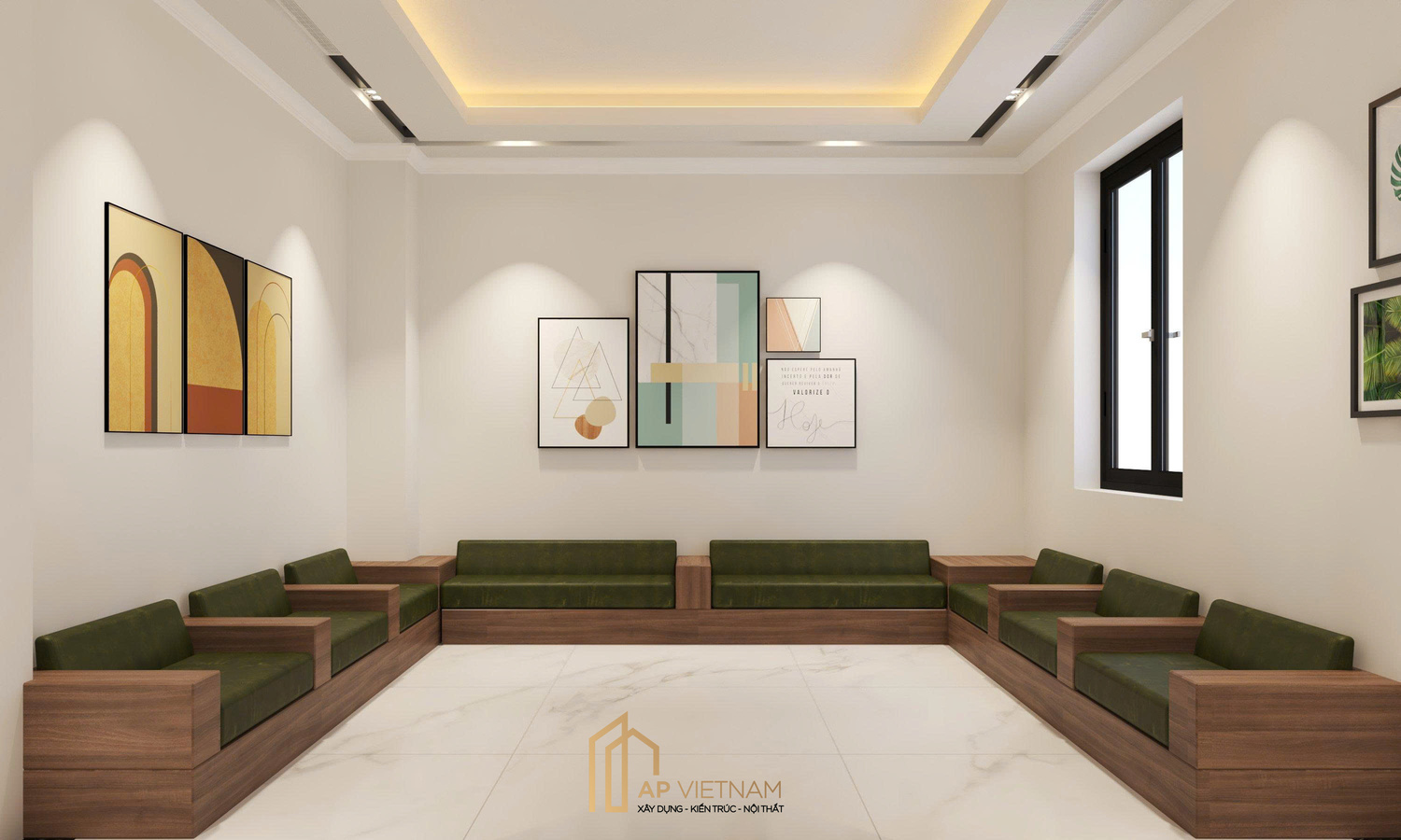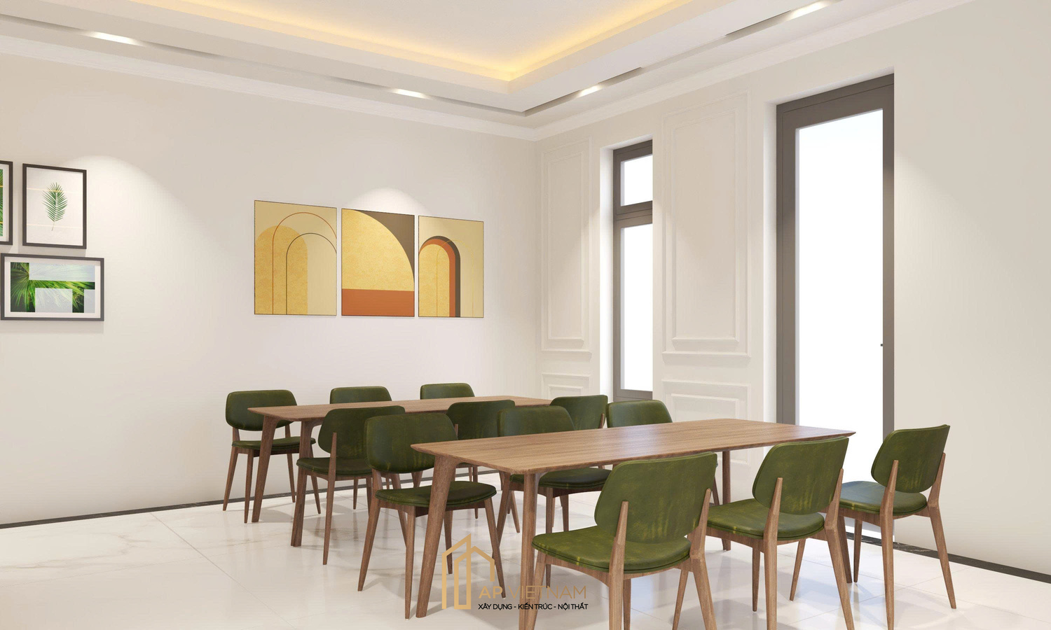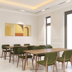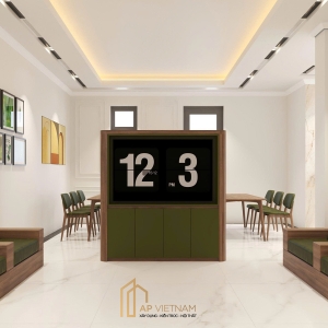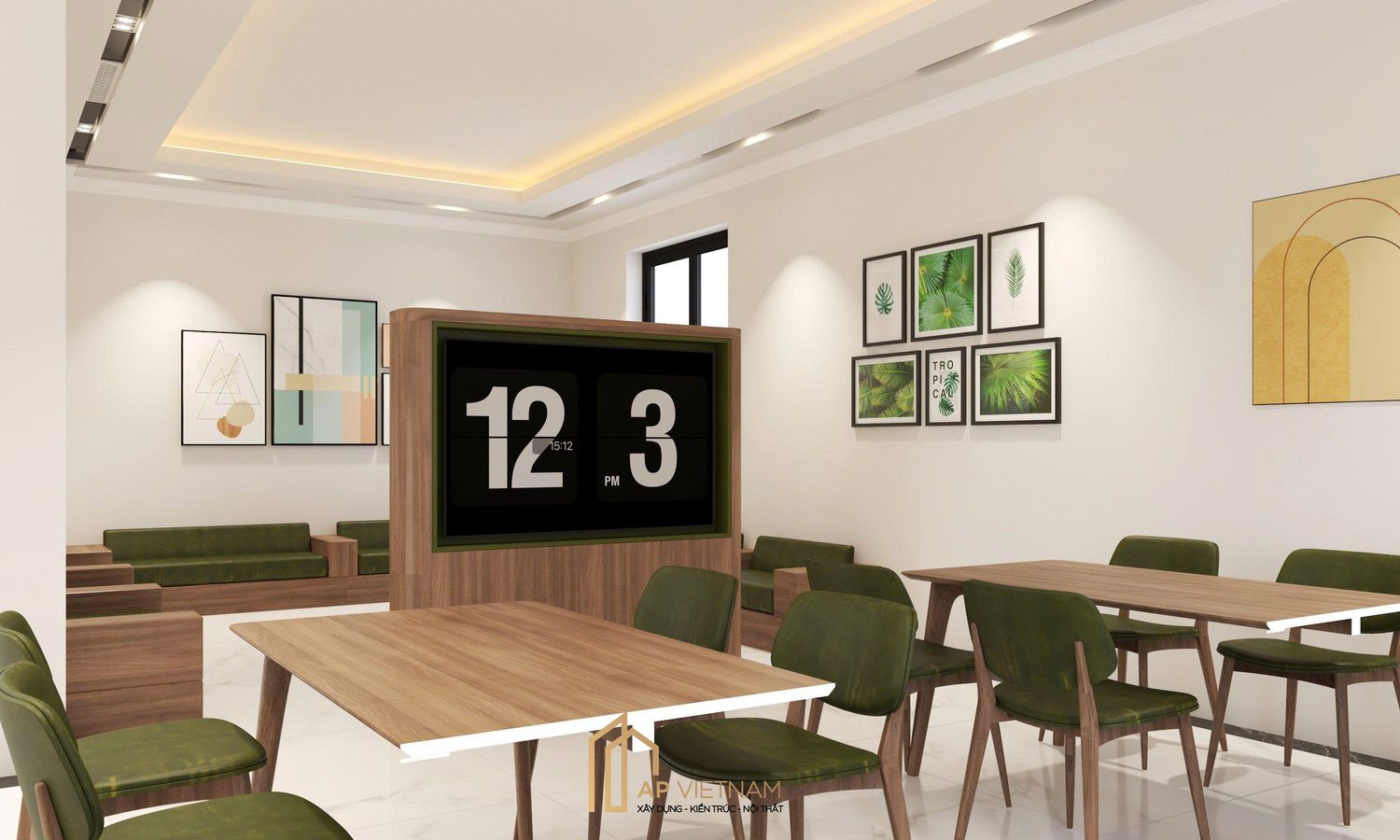 - Nhận diện thương hiệu được tích hợp hài hòa, tăng độ chuyên nghiệp cho tổng thể: sử dụng tông xanh điểm xuyết trên nội thất và sơn tường màu be tạo cảm giác ấm áp, thân thiện và tươi mới.