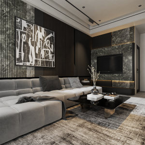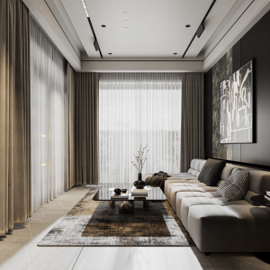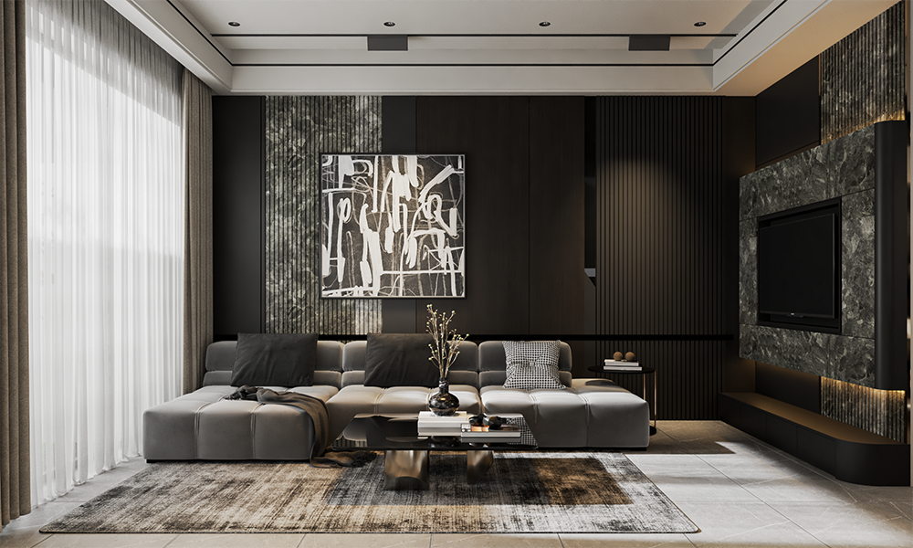 - Màu sắc chủ đạo: Tông xám, trắng và đen, kết hợp ấm áp từ gỗ và sang trọng của đá.