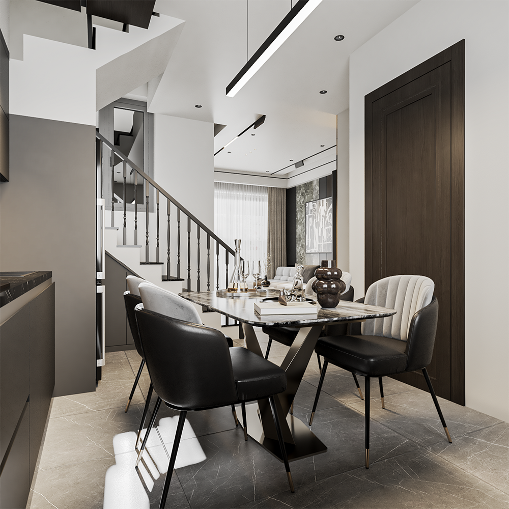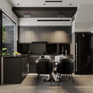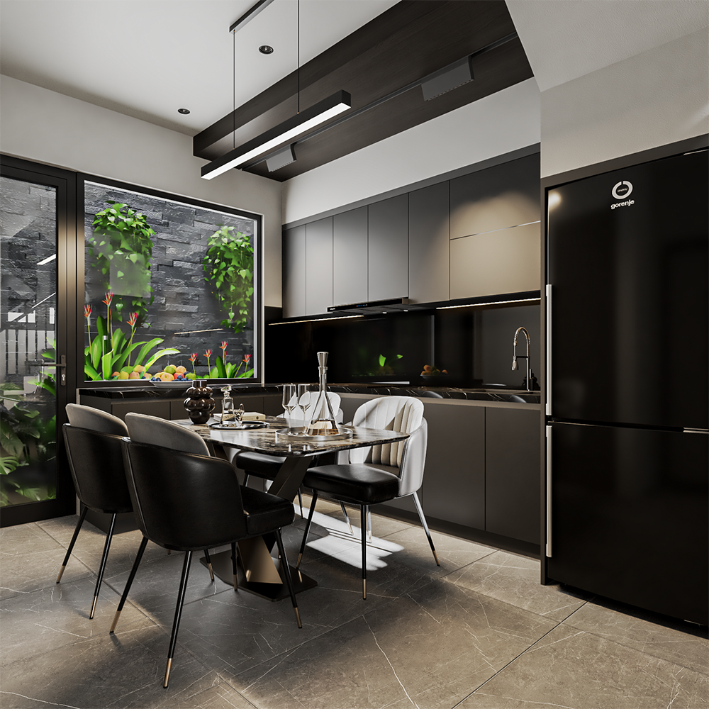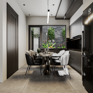 - Khu vực bếp được bố trí liền bàn ăn tạo sự thuận tiện và gắn kết.