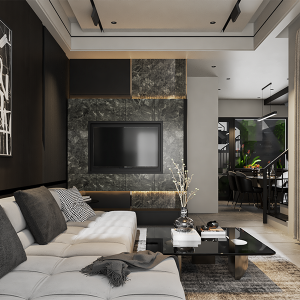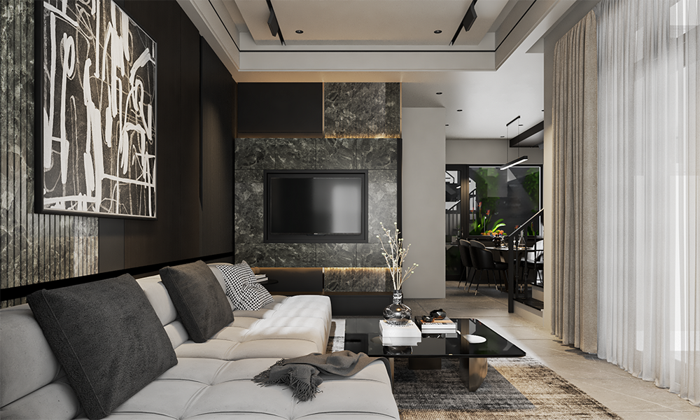 - Phòng khách sử dụng sofa chữ L màu sáng, bàn trà kính đen, kết hợp mảng tường đá tự nhiên ốp LED âm tường.