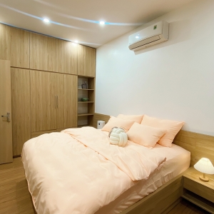 Phong cách thiết kế: Nội thất theo phong cách hiện đại – tối giản, sử dụng gam màu trung tính như trắng, be, nâu gỗ kết hợp cùng ánh sáng tự nhiên để mở rộng không gian thị giác, tạo cảm giác thoáng đãng.