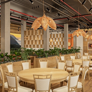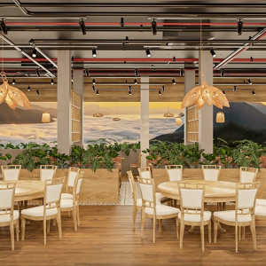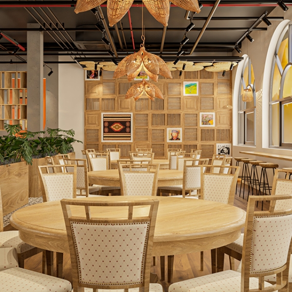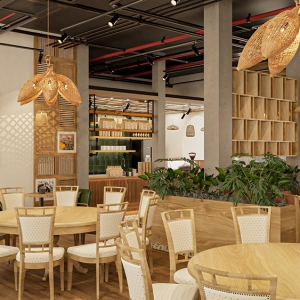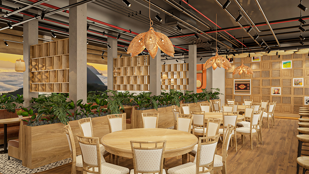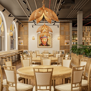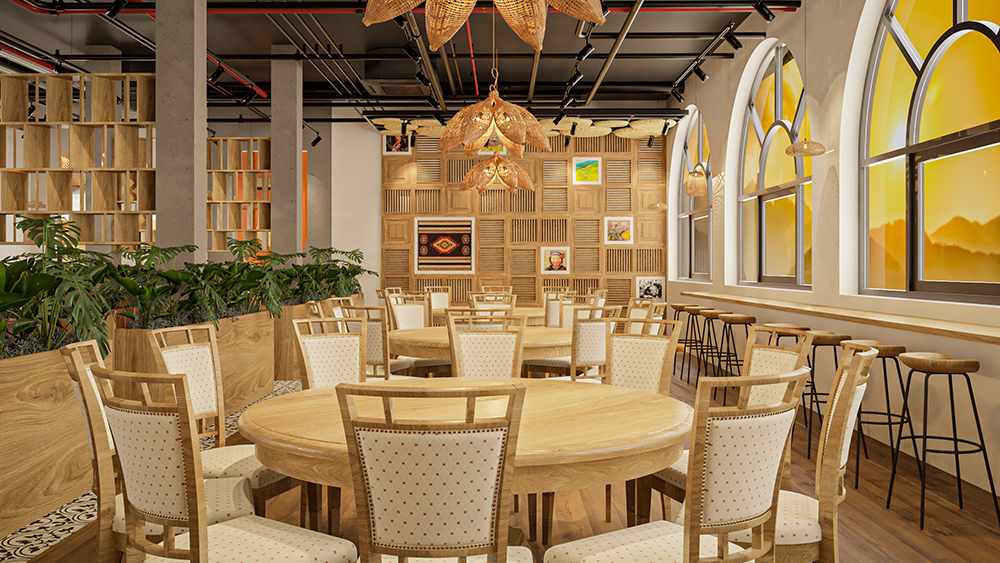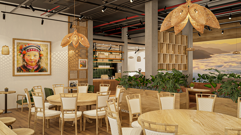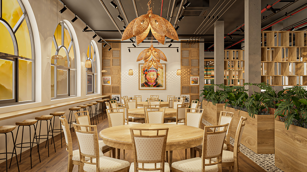 Phong cách dân tộc, lấy cảm hứng từ kiến trúc truyền thống Việt – sử dụng vật liệu tự nhiên như tre, nứa, gỗ, mây đan, kết hợp với hoa văn thổ cẩm, gốm sứ trang trí và ánh sáng vàng ấm. Không gian gợi cảm giác gần gũi, hoài niệm nhưng vẫn đảm bảo tiện nghi cho khách hàng.