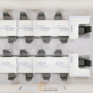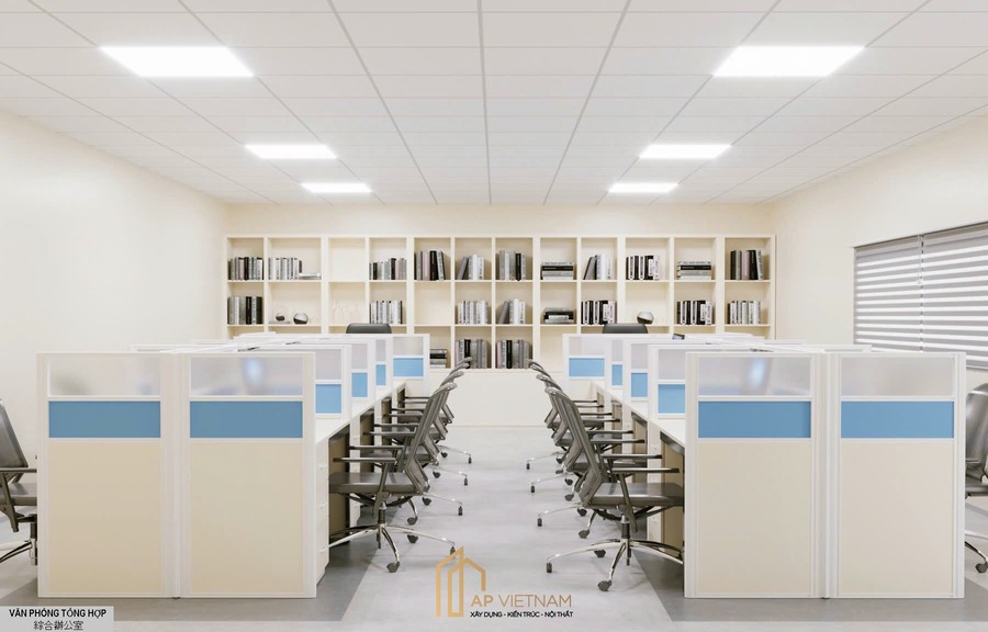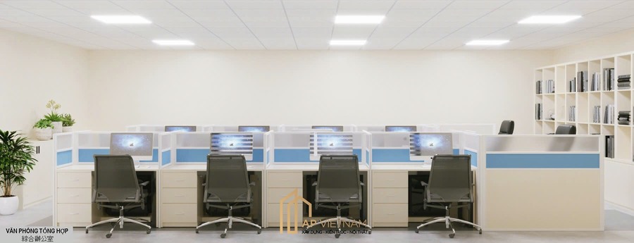 Toàn bộ không gian được thiết kế đồng bộ với tone màu sáng, vật liệu hiện đại và hệ thống chiếu sáng tiêu chuẩn văn phòng nhằm tạo cảm giác rộng rãi và chuyên nghiệp.