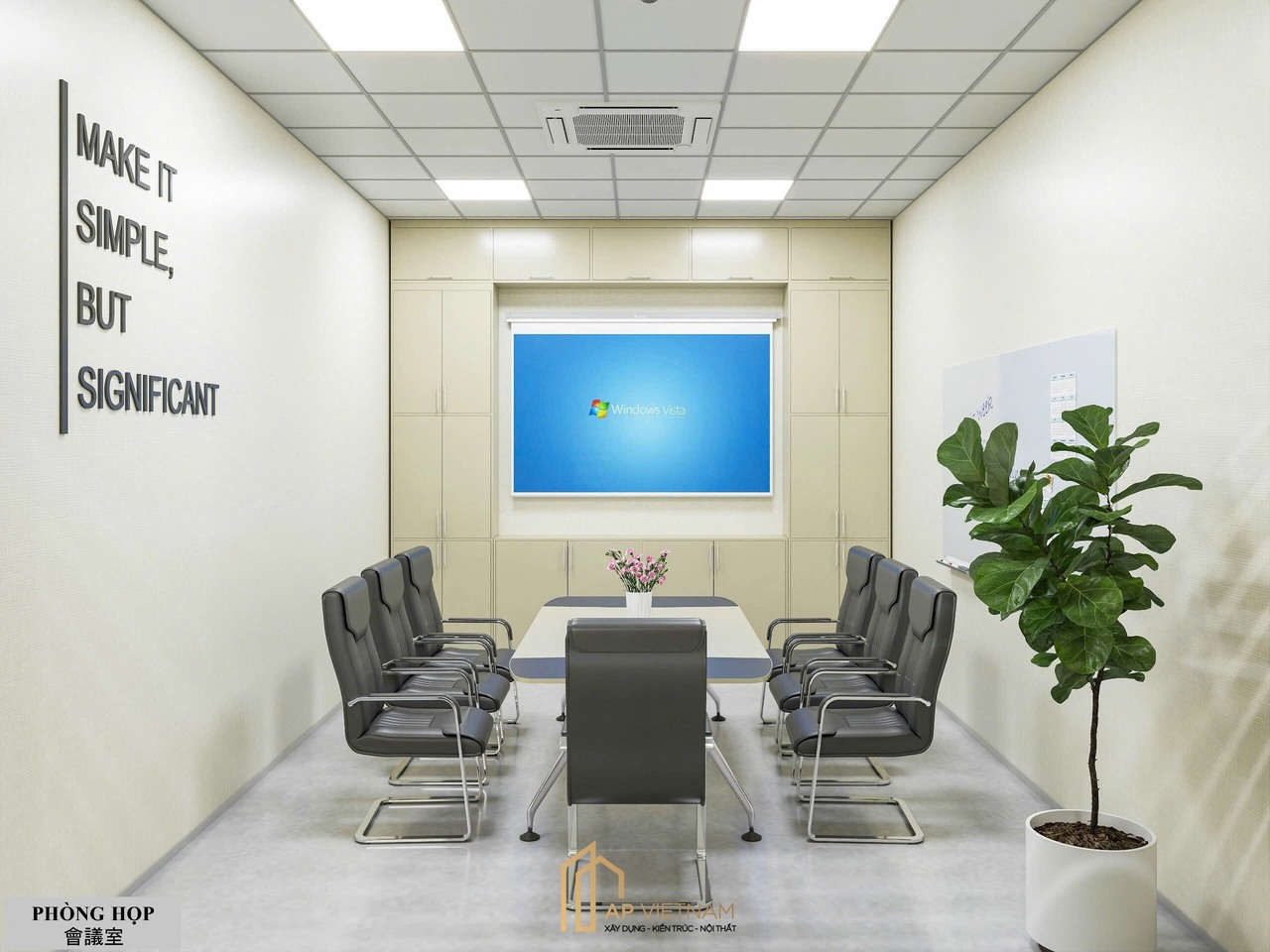 Phòng họp được thiết kế theo phong cách hiện đại, trang nhã, phù hợp cho các buổi họp nội bộ và tiếp khách. Các điểm nhấn của phòng họp: Bàn họp trung tâm kết hợp ghế da cao cấp dễ vệ sinh, trang thiết bị trình chiếu được trang bị đầy đủ và hợp lý