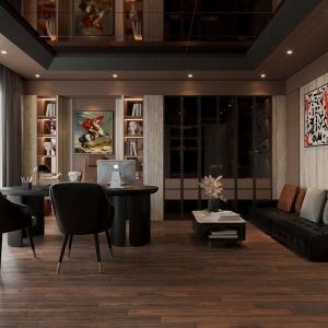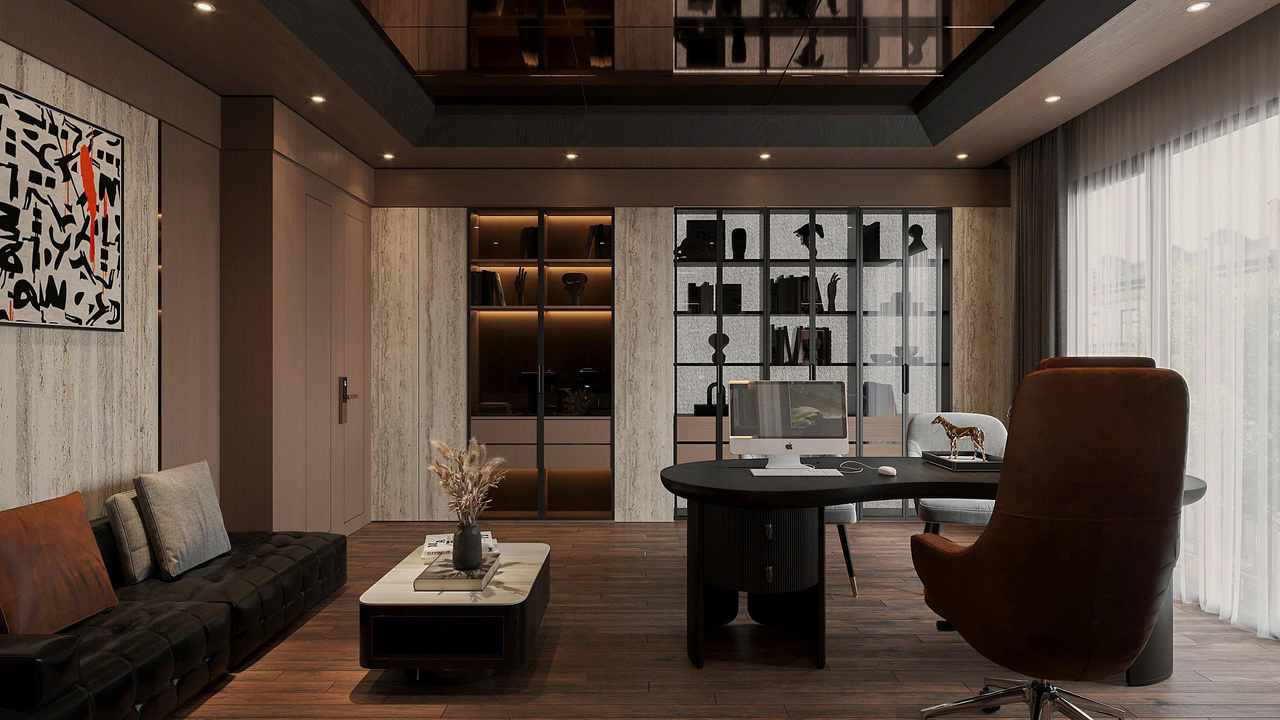 + Khu vực tiếp khách: Sofa da cao cấp, bàn trà thấp, không gian đón tiếp thân thiện mà vẫn giữ nét sang trọng.