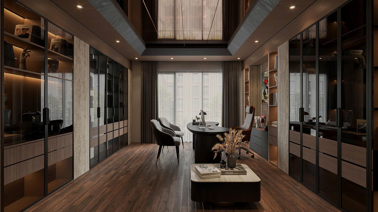 + Hệ thống chiếu sáng thông minh: Đèn âm trần kết hợp đèn rọi và đèn bàn, tạo hiệu ứng ánh sáng mềm mại, hỗ trợ làm việc tập trung.