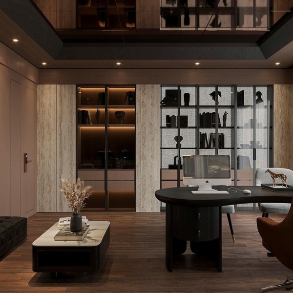 + Vật liệu chủ đạo: Gỗ veneer cao cấp, kính cường lực khung nhôm đen, da thật, đá tự nhiên.