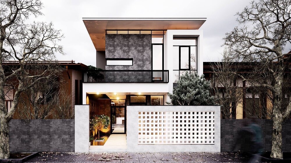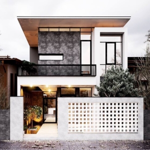 - Mặt tiền mang phong cách hiện đại với khối hình vuông vức.