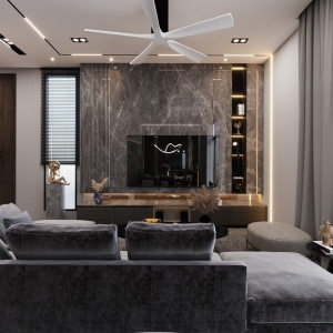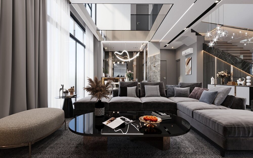 - Bộ sofa lớn hình chữ U, tông xám nhung sang trọng.