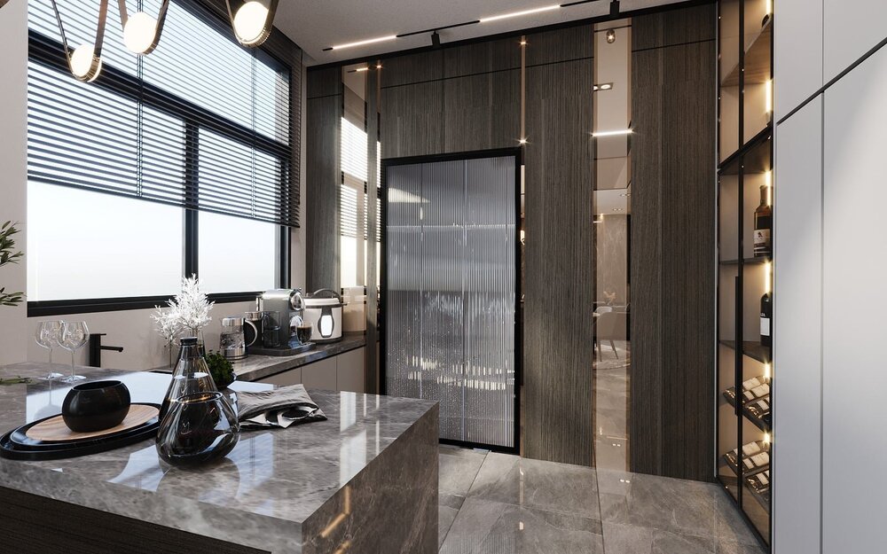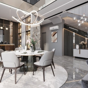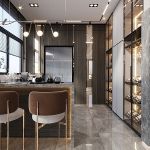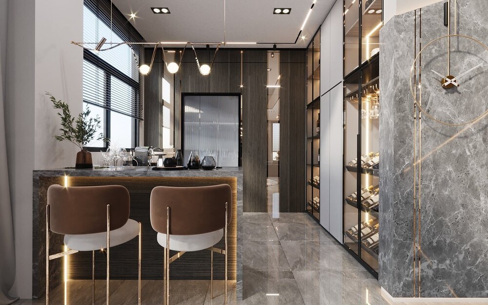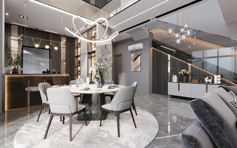 - Khu bàn ăn và quầy bar mini, ánh sáng decor tạo điểm nhấn.