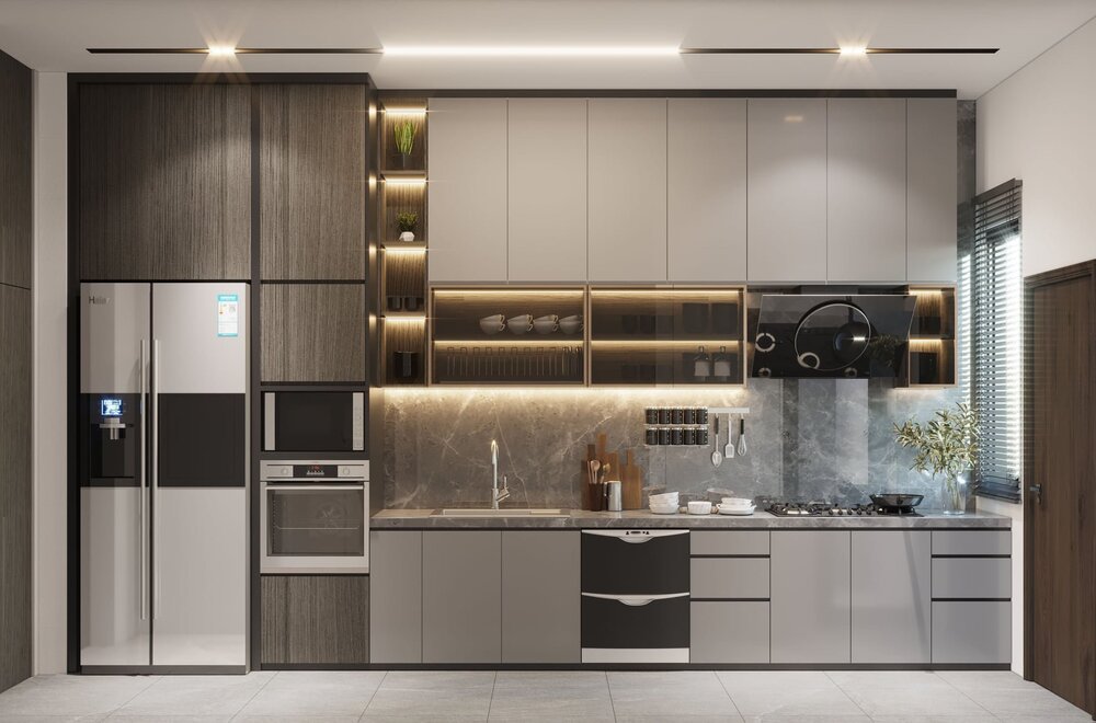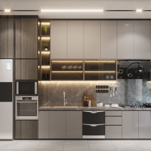 - Thiết kế bếp chữ I, kết hợp tủ gỗ công nghiệp hiện đại.
