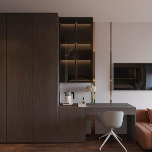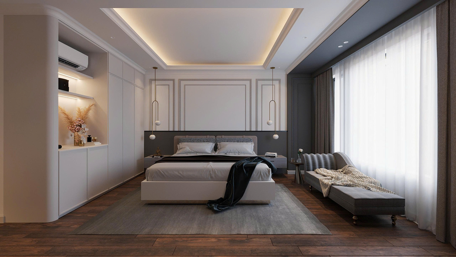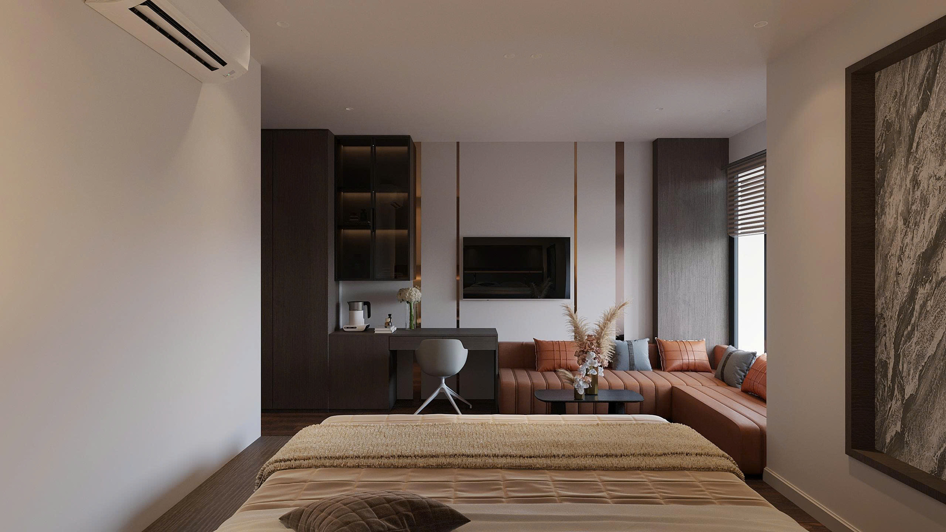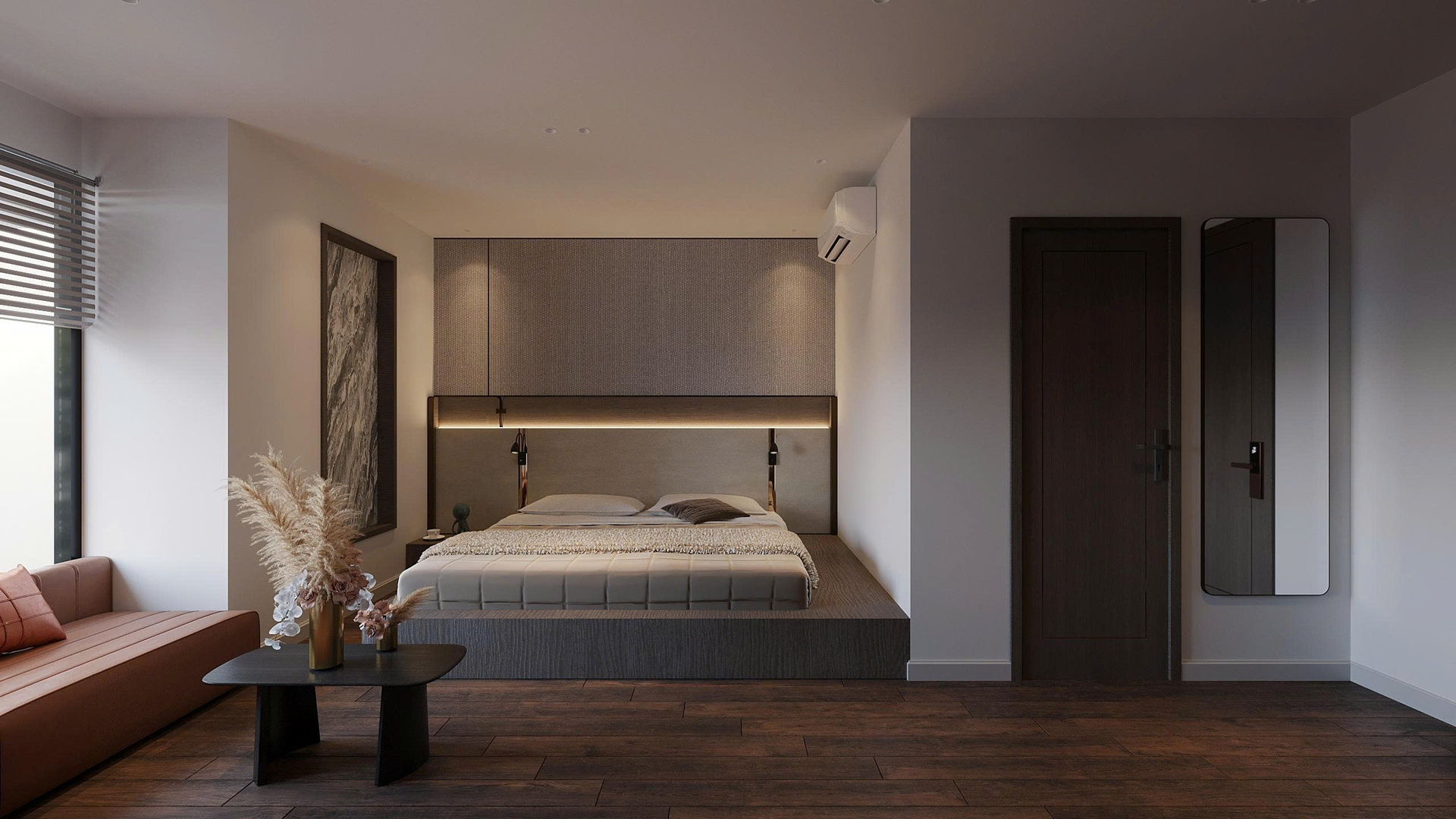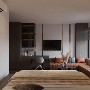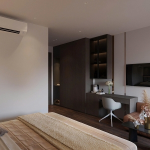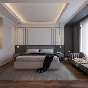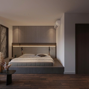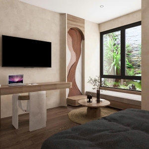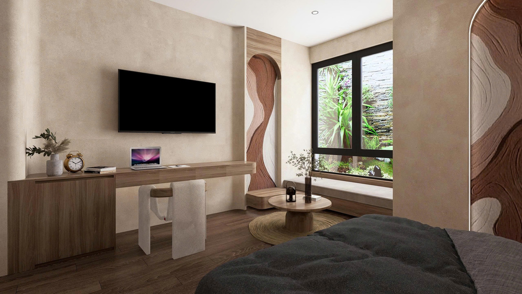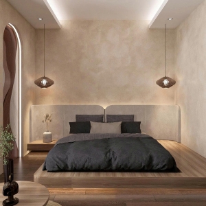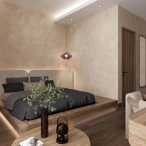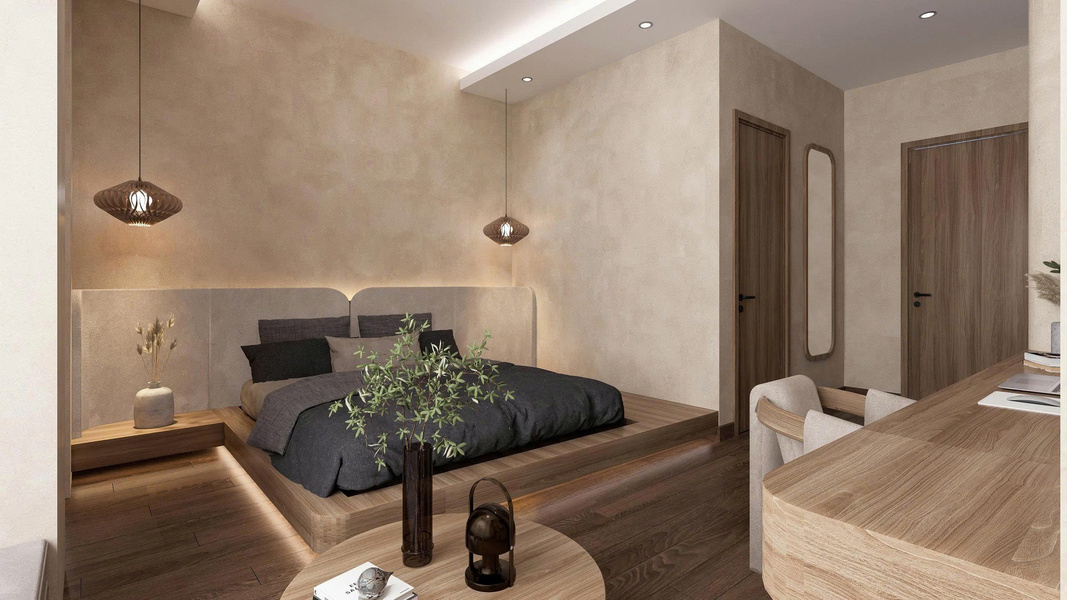 Phong cách Wabi Sabi trong căn phòng là sự hòa quyện của các vật liệu thô mộc, nguyên bản. Bức tường được sơn màu trung tính, vân vữa gợi cảm giác đất sét, cát mịn; kết hợp với sàn gỗ tối màu tạo sự ấm cúng, vững chãi. Ánh sáng nhân tạo đến từ các đèn treo hình học tối giản, làm từ mây/tre và hệ thống đèn hắt ẩn, tạo ra những mảng sáng tối dịu dàng, giúp không gian phòng ngủ trở nên sâu lắng và thư giãn tuyệt đối.