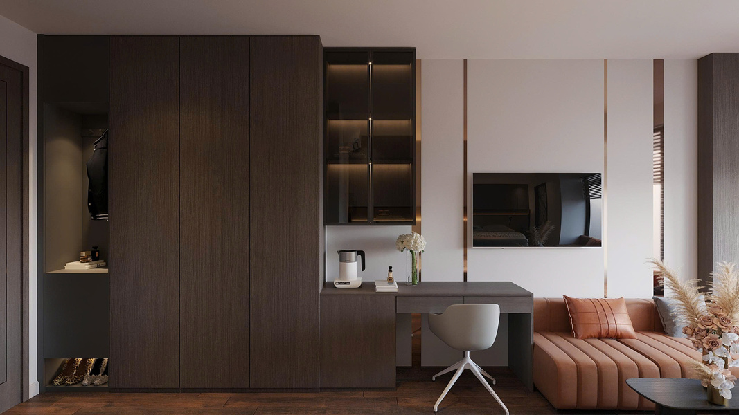 Các đường nét gọn gàng, vật liệu cao cấp và bảng màu trung tính giúp không gian trở nên tươi mới, tinh gọn nhưng vẫn sang trọng, dễ dàng thể hiện bản sắc thương hiệu riêng biệt.