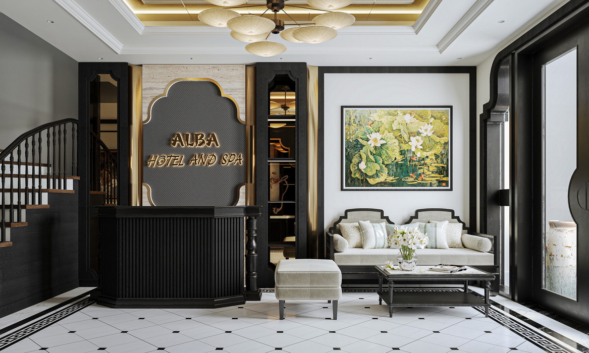 Khu vực lễ tân được bố trí ngay trung tâm, nổi bật với bảng hiệu “ALBA Hotel and Spa” ánh vàng sang trọng. Quầy lễ tân ốp gỗ sẫm màu kết hợp đường cong mềm mại, mang lại cảm giác đẳng cấp và chuyên nghiệp. Bên cạnh đó là khu ghế chờ tiếp khách tinh tế với sofa bọc nệm sáng màu, bàn trà nhỏ và bình hoa tươi, tạo không khí ấm cúng và thư thái ngay từ cái nhìn đầu tiên.