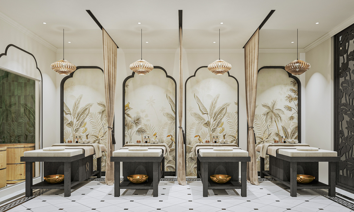 Khu spa được bố trí mở và linh hoạt, ngăn cách bằng rèm lụa nhẹ nhàng, đảm bảo sự riêng tư cho khách hàng mà vẫn giữ được sự thông thoáng, gần gũi.