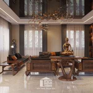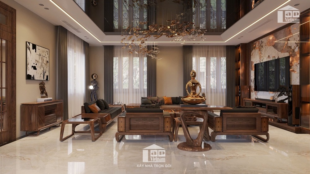 Phòng khách rộng rãi, trần cao với đèn chùm nghệ thuật độc đáo là điểm nhấn nổi bật. Bộ sofa gỗ kết hợp đệm da cao cấp cùng bàn trà sang trọng, mang lại sự ấm cúng cho không gian tiếp khách.