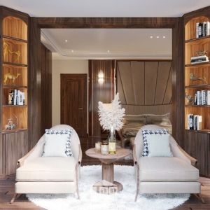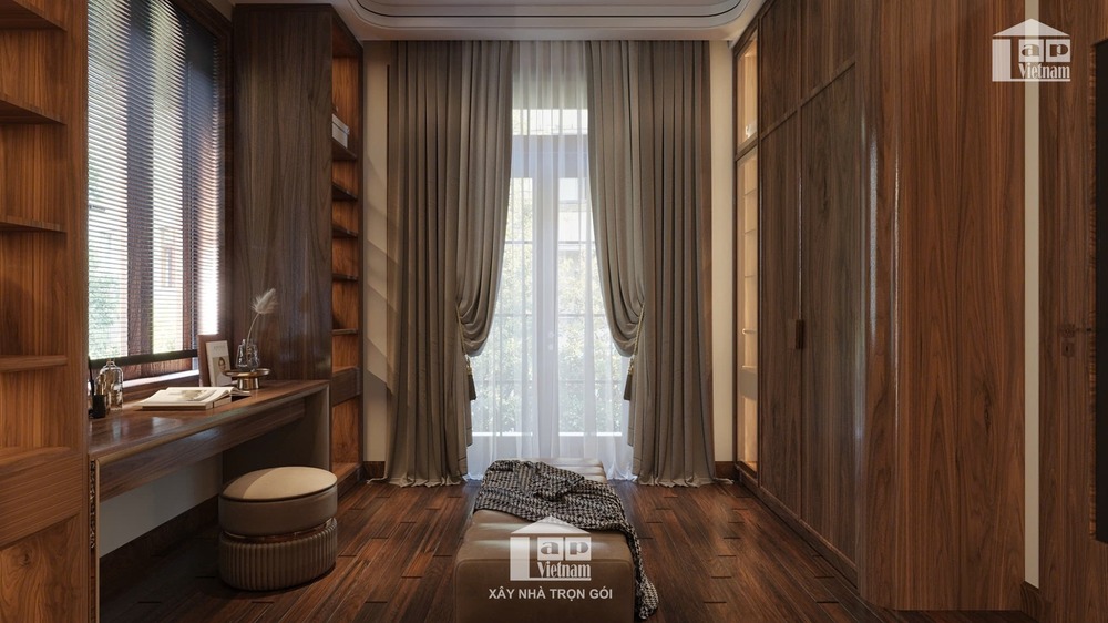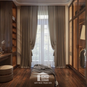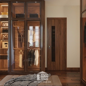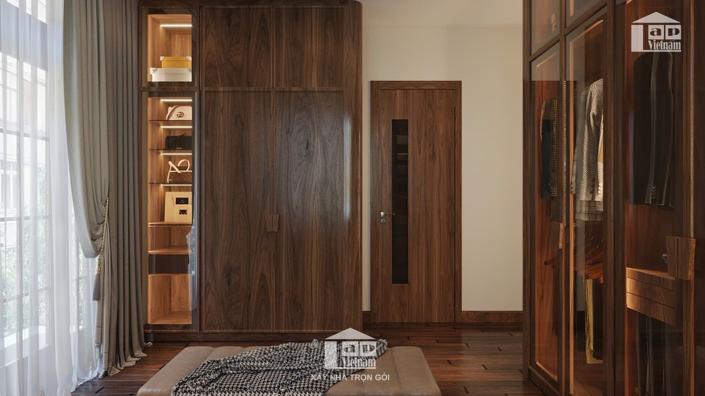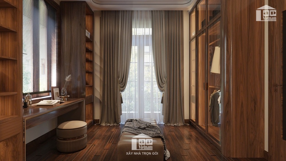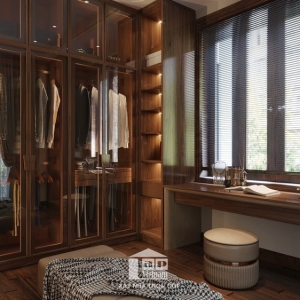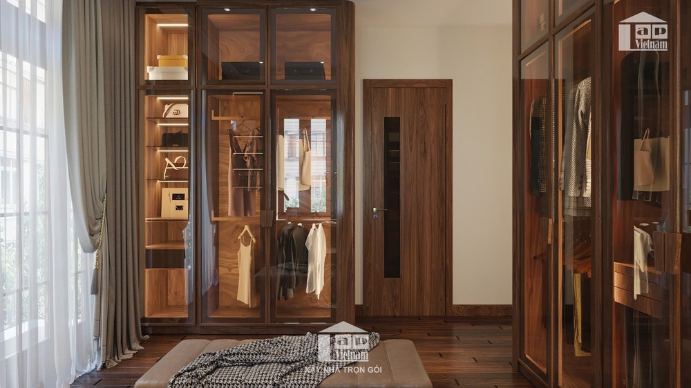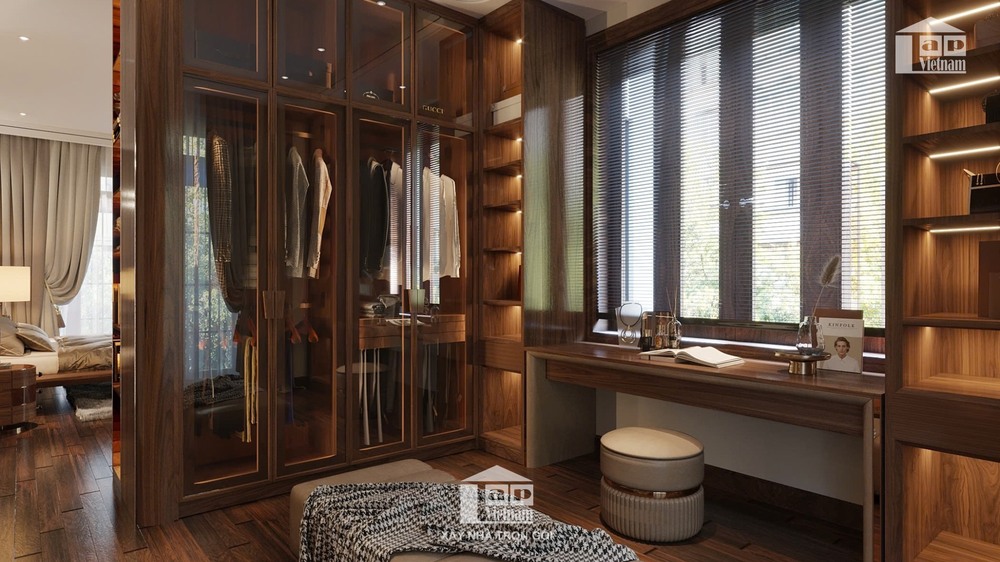 Không gian còn được tích hợp khu vực thay đồ riêng với tủ quần áo kính trong suốt, sang trọng và tiện nghi. Cạnh đó là góc đọc sách, uống trà đầy thư thái, mang đến trải nghiệm nghỉ ngơi lý tưởng.