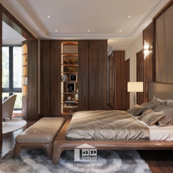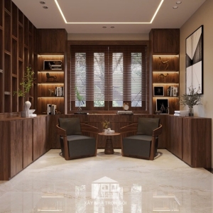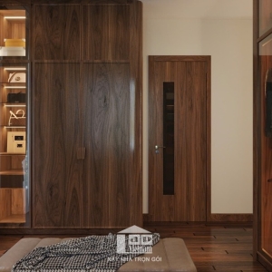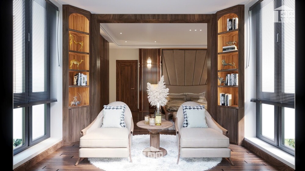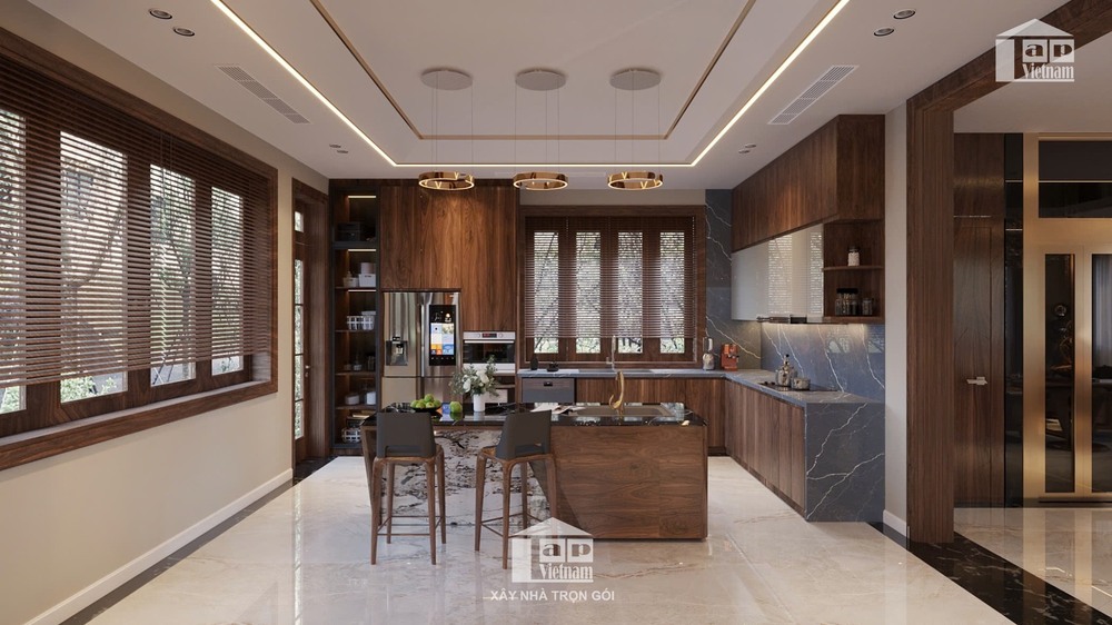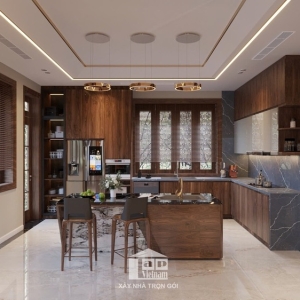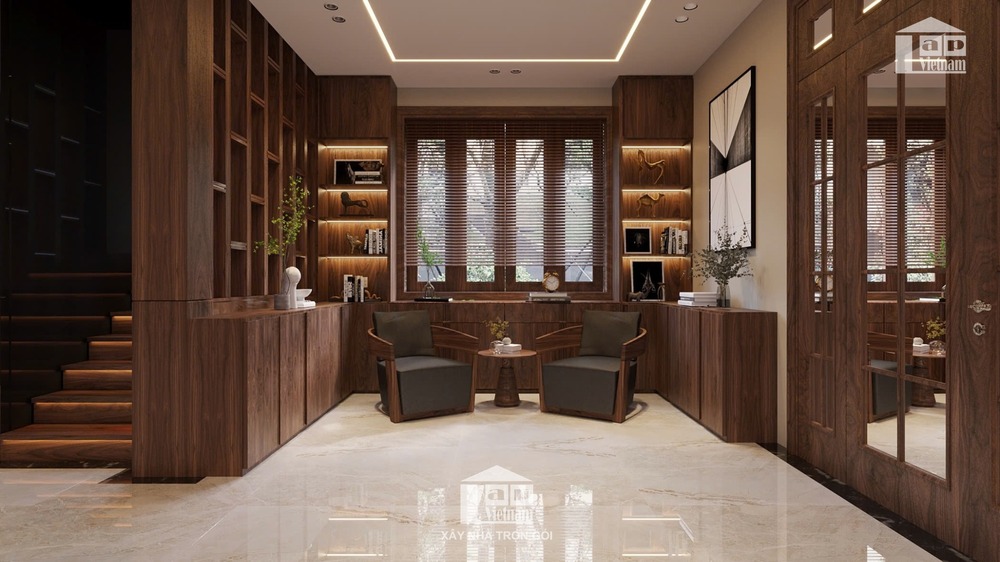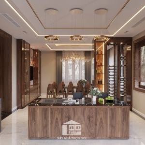 Biệt thự được thiết kế theo phong cách hiện đại, tối giản nhưng tinh tế, với điểm nhấn là chất liệu gỗ tự nhiên cao cấp kết hợp cùng đá marble sang trọng. Sự phối hợp khéo léo giữa tông màu nâu ấm áp và ánh sáng tự nhiên mang đến cảm giác vừa gần gũi vừa đẳng cấp.