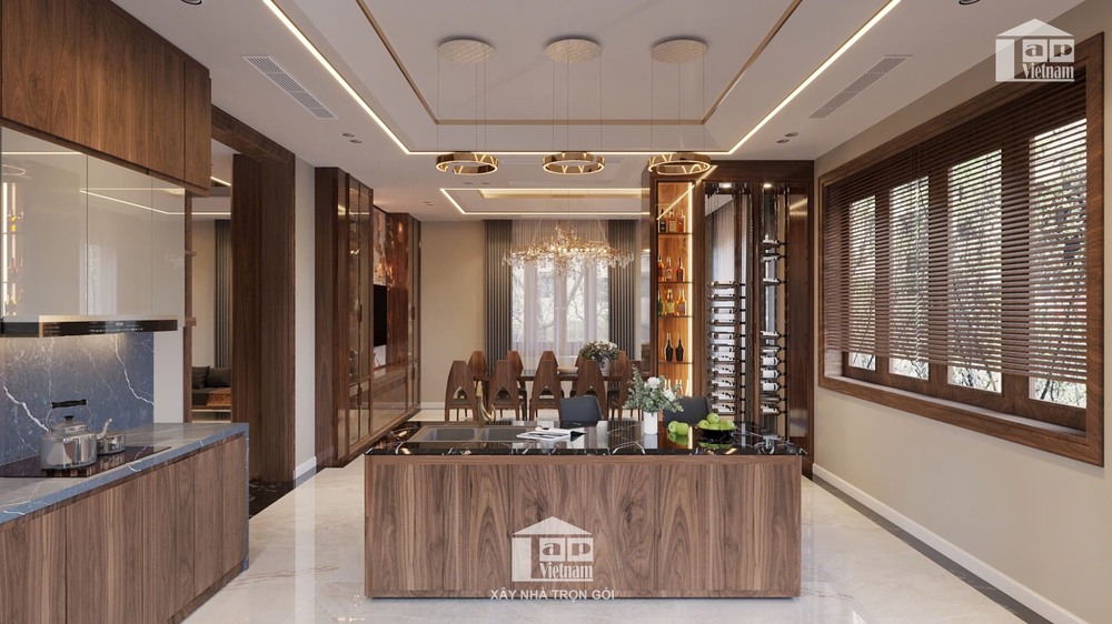Hệ thống tủ bếp âm tường hiện đại, đầy đủ công năng, kết hợp cùng đèn chùm pha lê tinh xảo khiến không gian trở nên đẳng cấp như một khách sạn 5 sao.