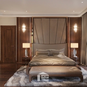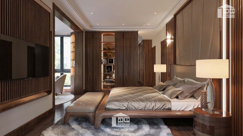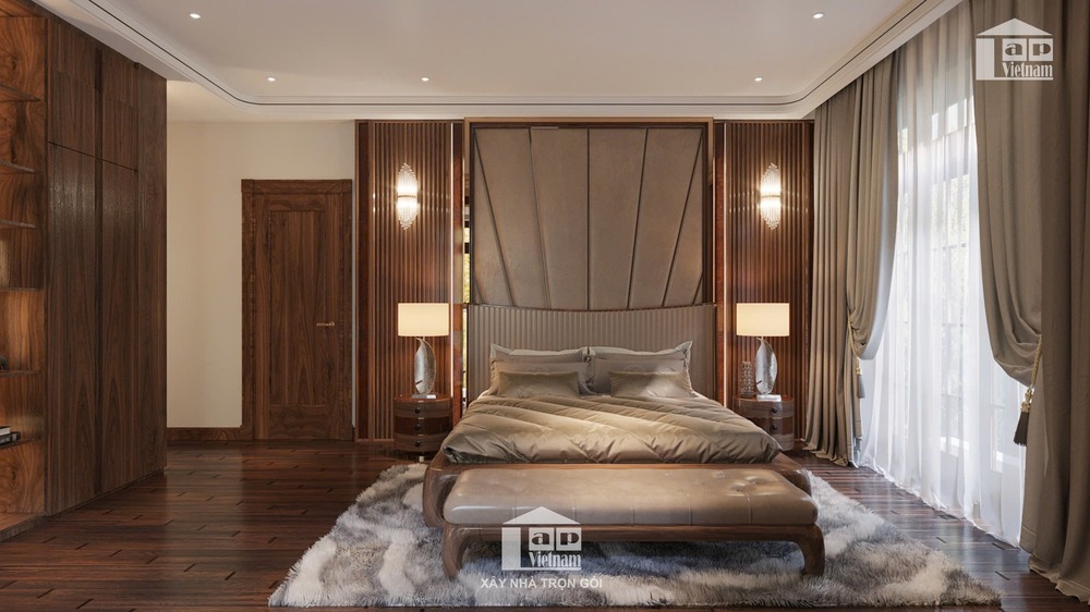 Phòng ngủ chính được thiết kế theo phong cách ấm áp và thư giãn, với giường gỗ hiện đại, ga trải giường cao cấp và hệ thống đèn ngủ ánh sáng dịu nhẹ.