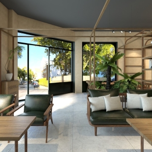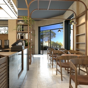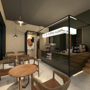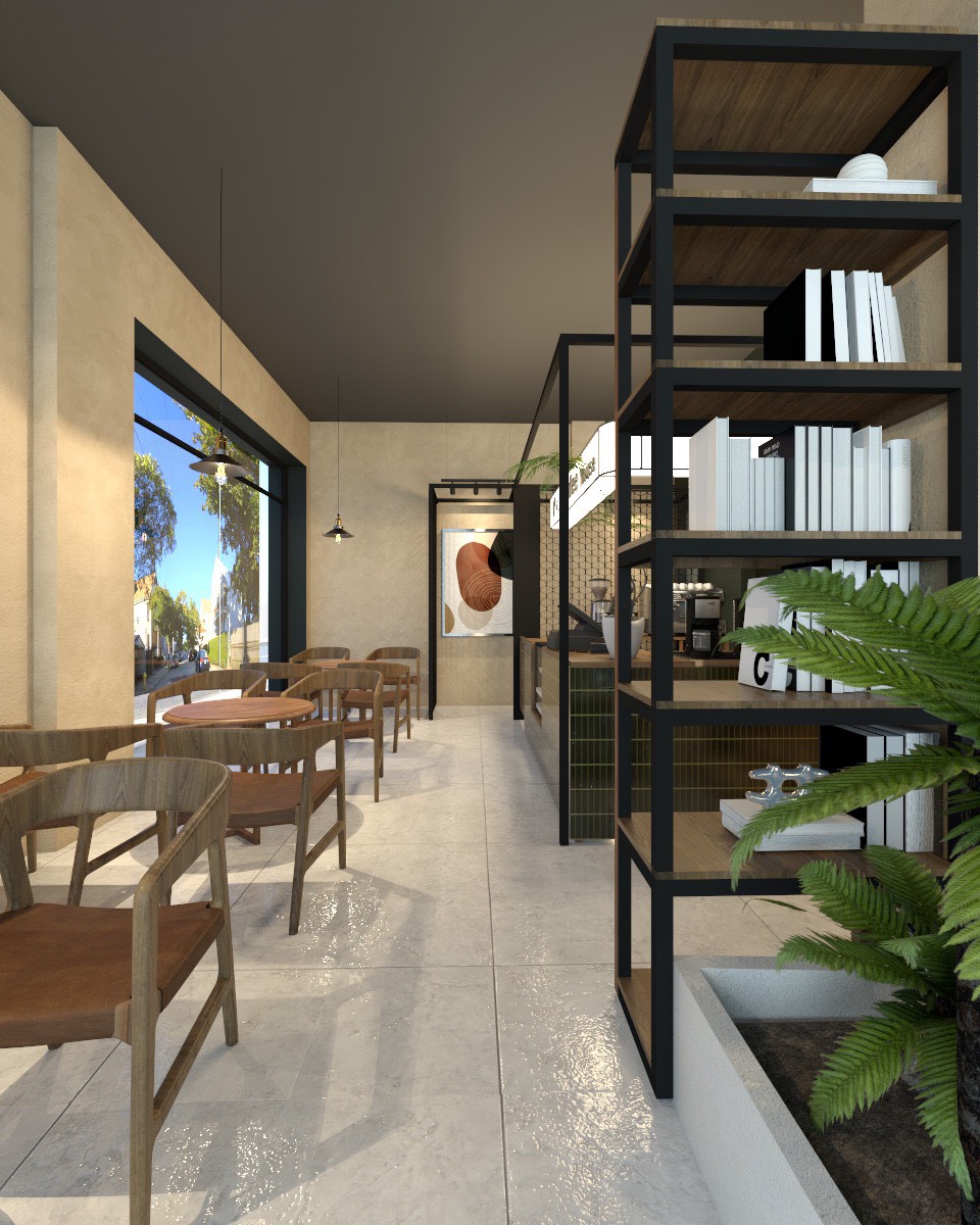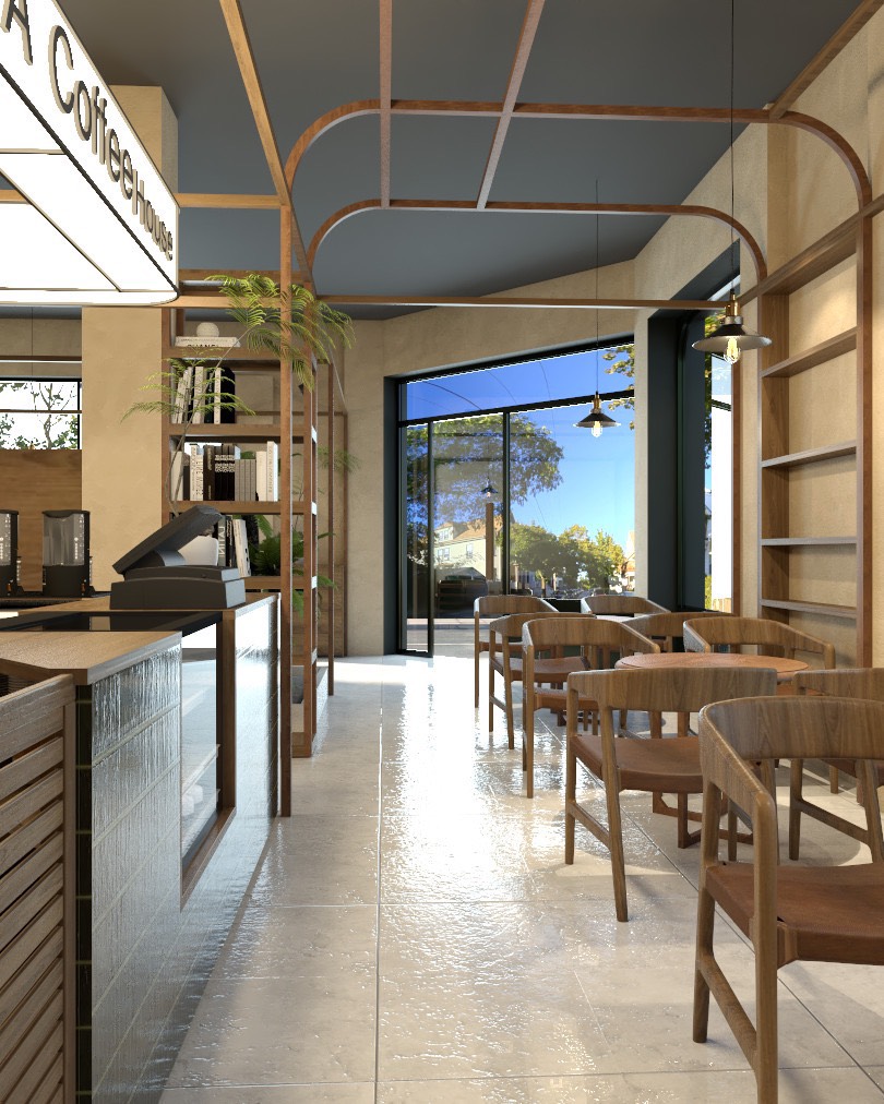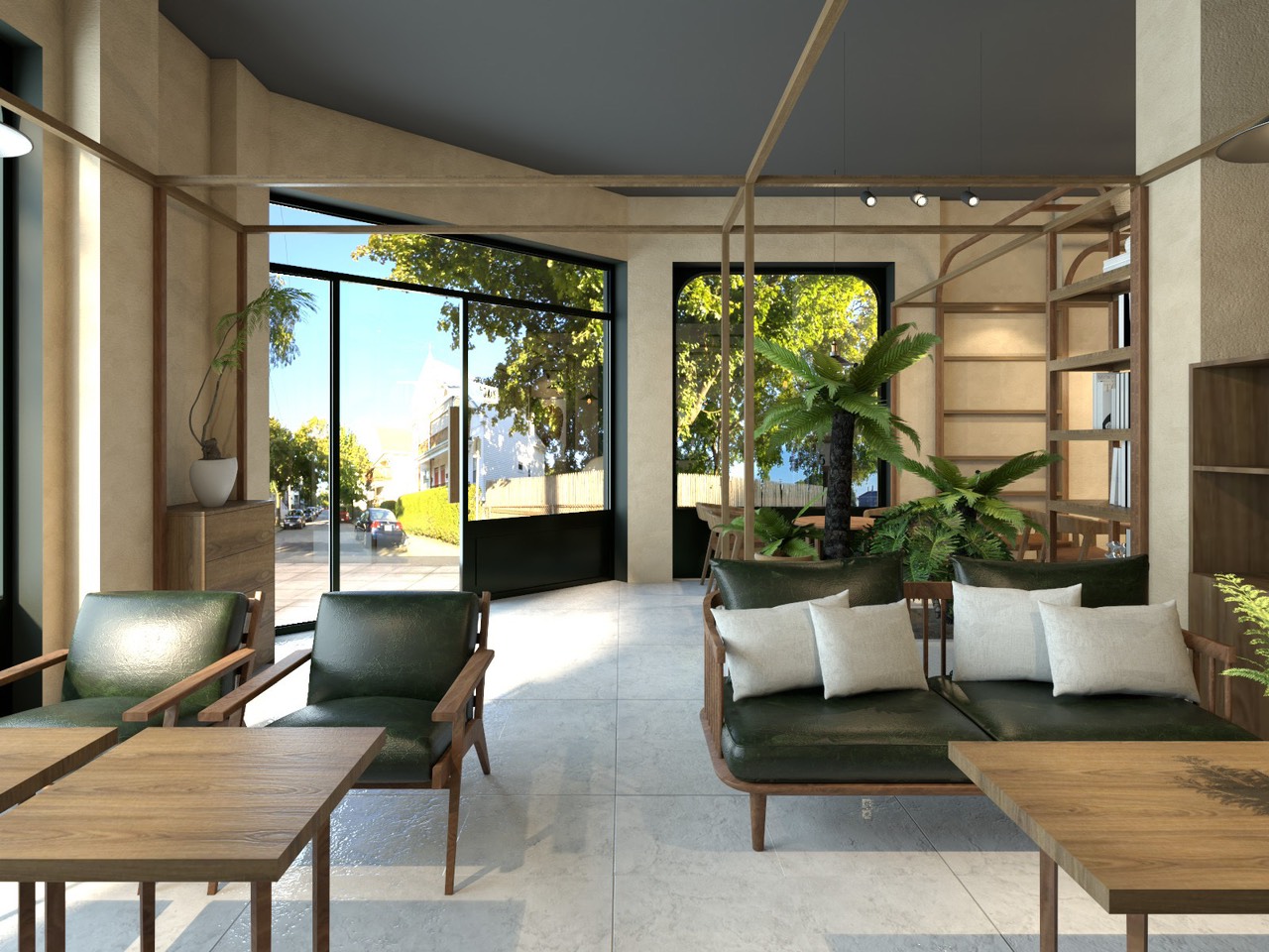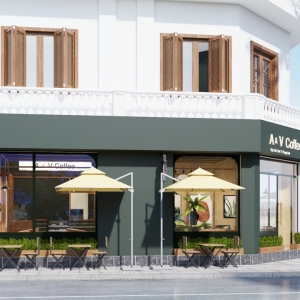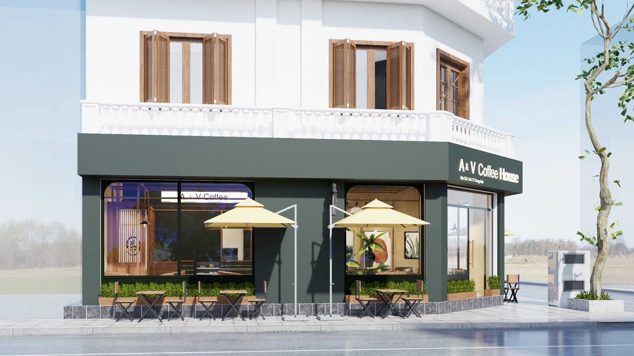 Tạo không gian quán cafe đậm chất màu thương hiệu của Chủ đầu tư. Với vị trí căn góc 2 mặt tiền, đề bài được đặt ra cho thiết kế sao cho biển hiệu nổi bật và tận dụng tối đa không gian ngoài trời.