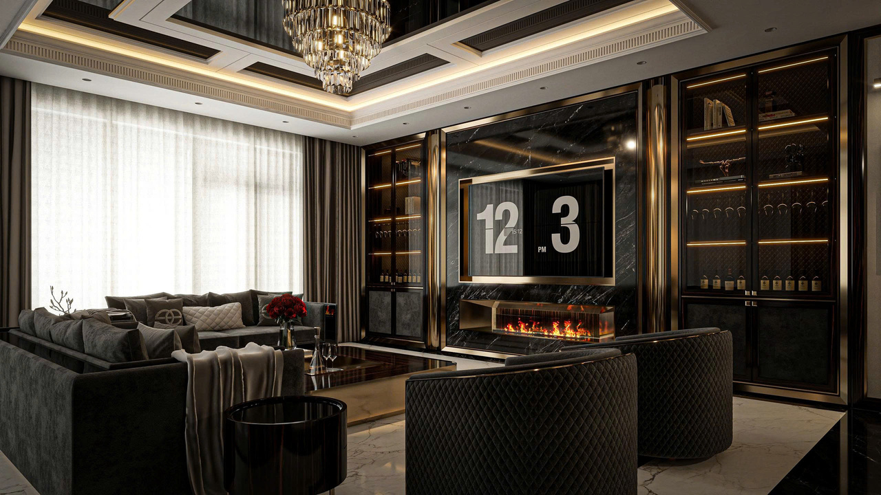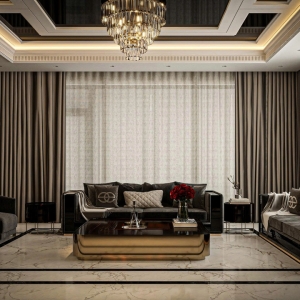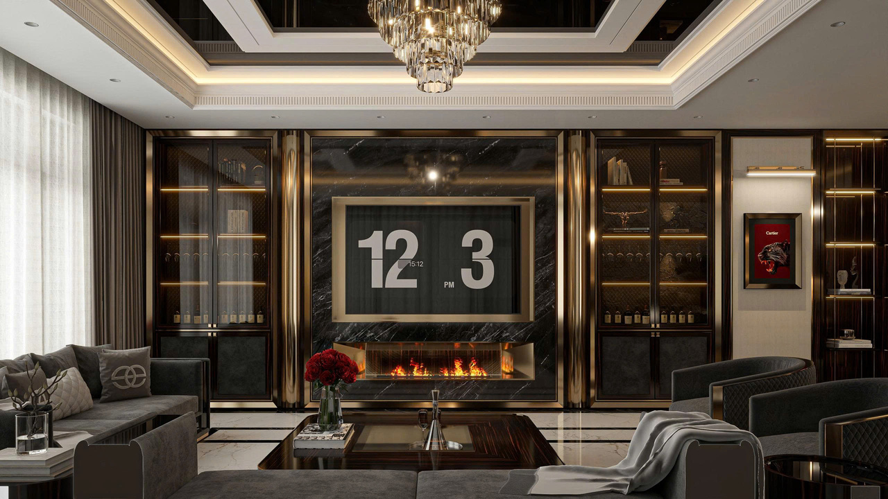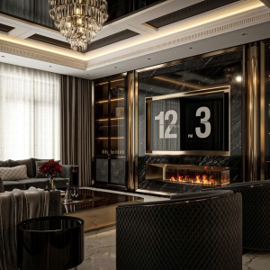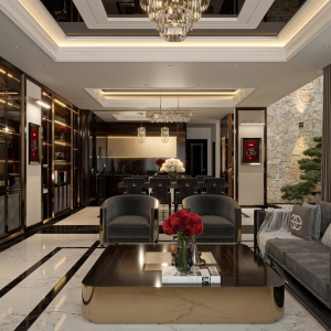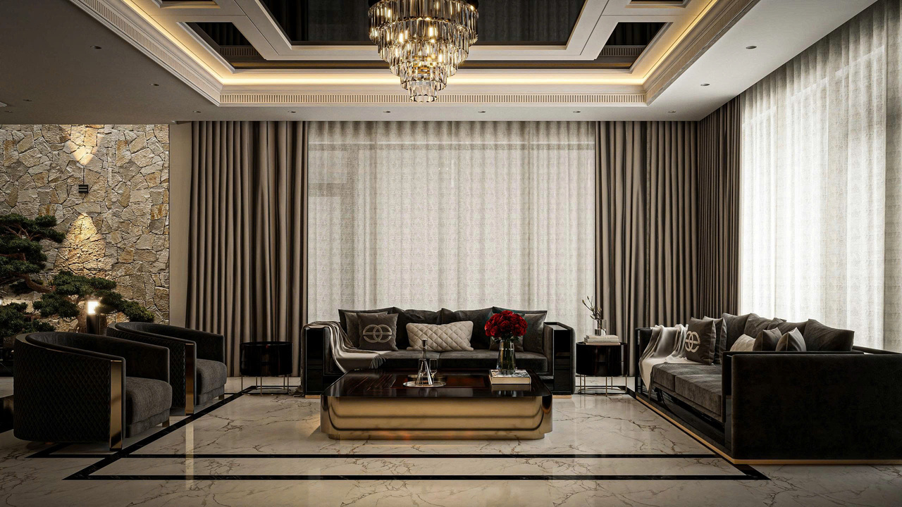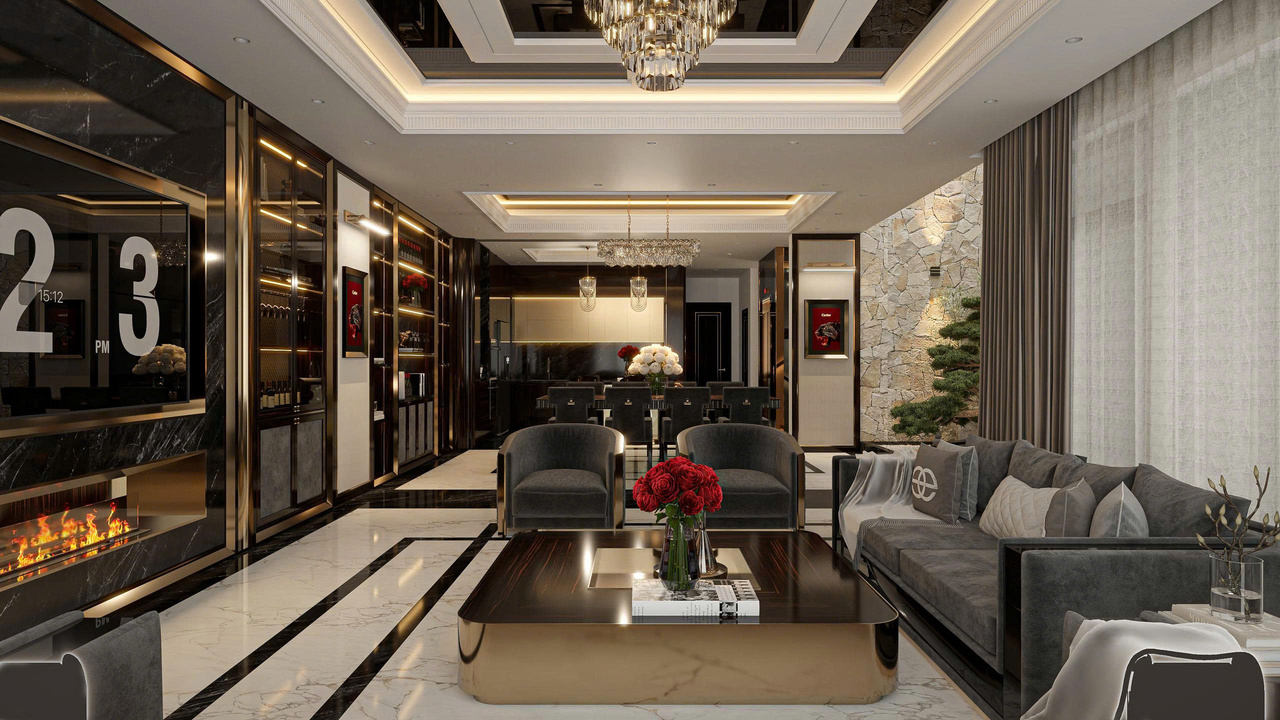 - Phòng khách là trái tim của căn hộ với tone màu trầm chủ đạo, kết hợp đá marble đen – trắng và hệ ánh sáng vàng hắt từ trần thạch cao, tạo cảm giác quyền lực nhưng vẫn ấm áp.