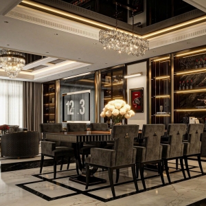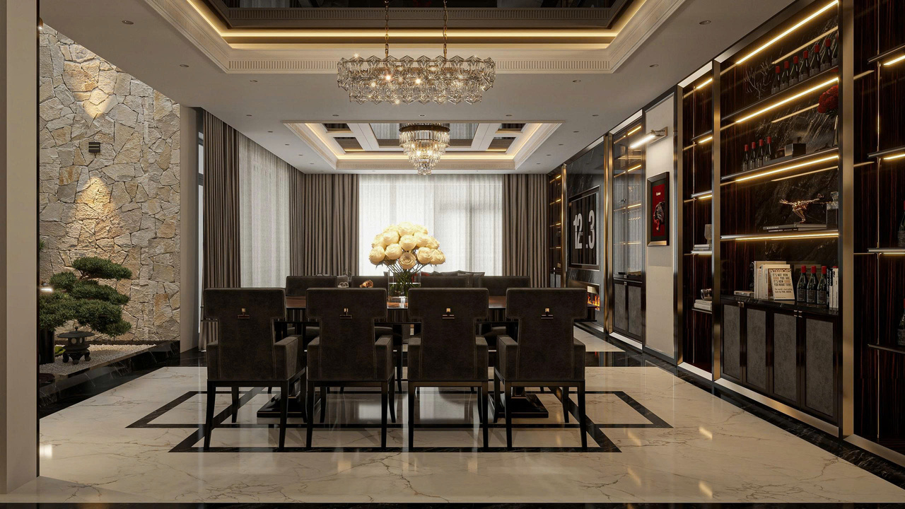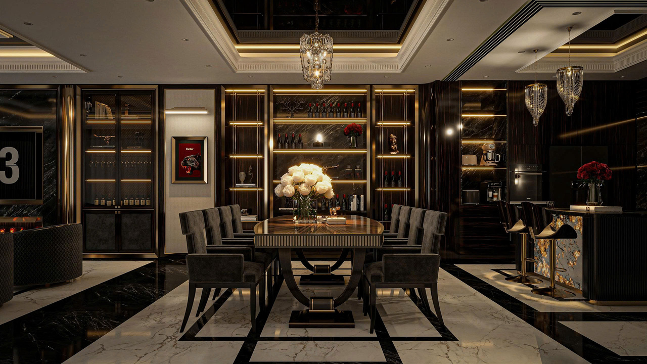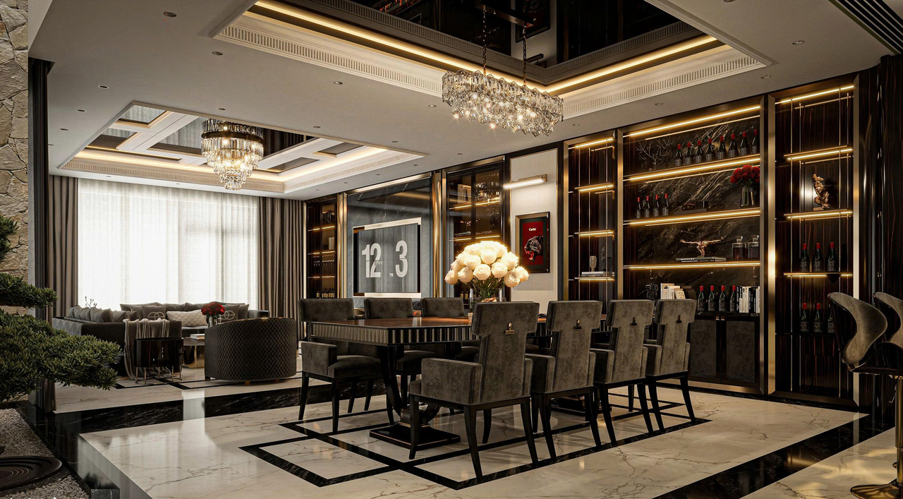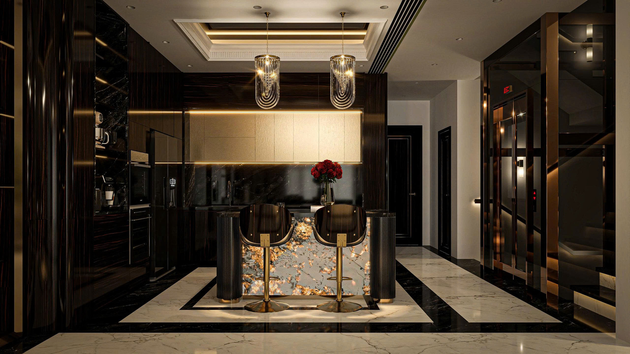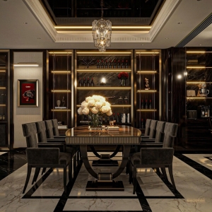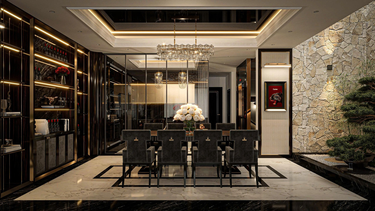- Hệ tủ rượu âm tường kịch trần, ánh sáng led ẩn vàng kim cùng những chiếc đèn chùm pha lê tinh xảo, tạo nên khung cảnh lộng lẫy như một phòng tiệc quý tộc.