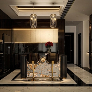 - Khu bếp bar với đảo bếp ốp đá vân độc đáo, ghế bar thiết kế cong mềm mại, tạo nên không gian lý tưởng cho những buổi trò chuyện hoặc tiệc rượu nhẹ.