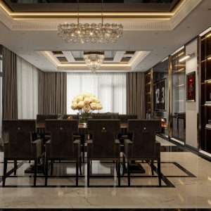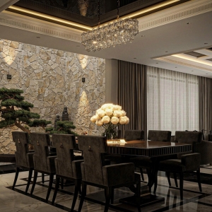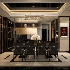 - Không gian phòng ăn được thiết kế liền kề, mang phong cách tiệc tối sang trọng với bàn ăn gỗ phủ bóng, ghế bọc nhung đen đồng bộ.