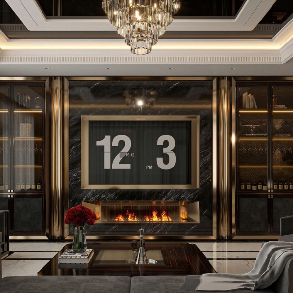 - Điểm nhấn nổi bật chính là vách TV ốp đá đen vân mây, khung viền kim loại ánh vàng, kết hợp lò sưởi giả lập, mang đến một không gian ấm cúng, đậm chất châu Âu hiện đại.