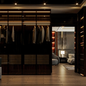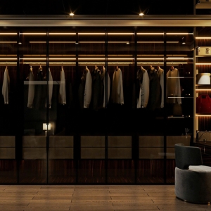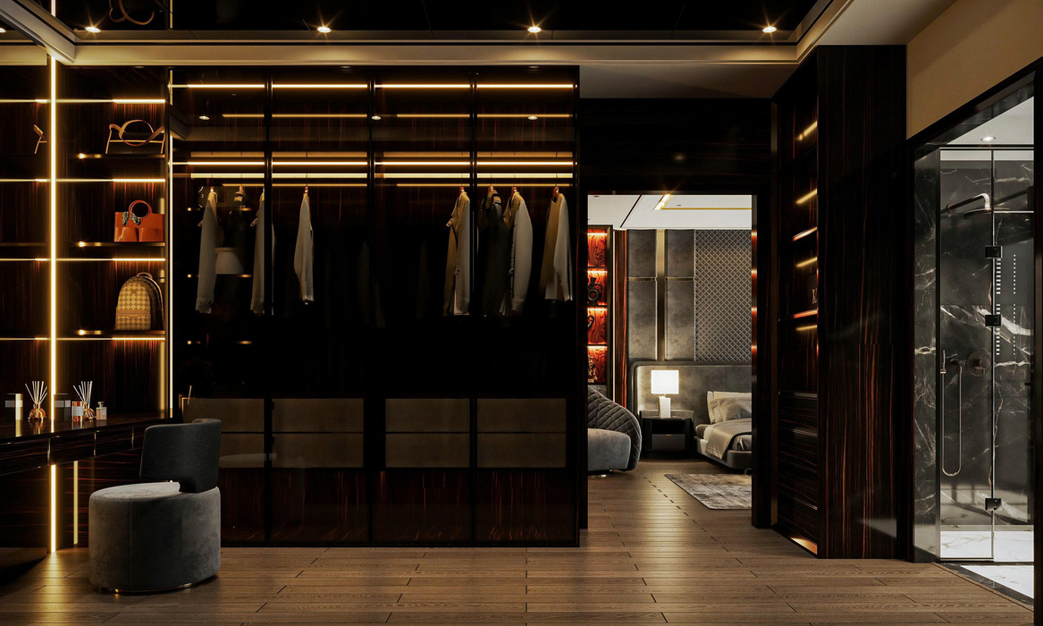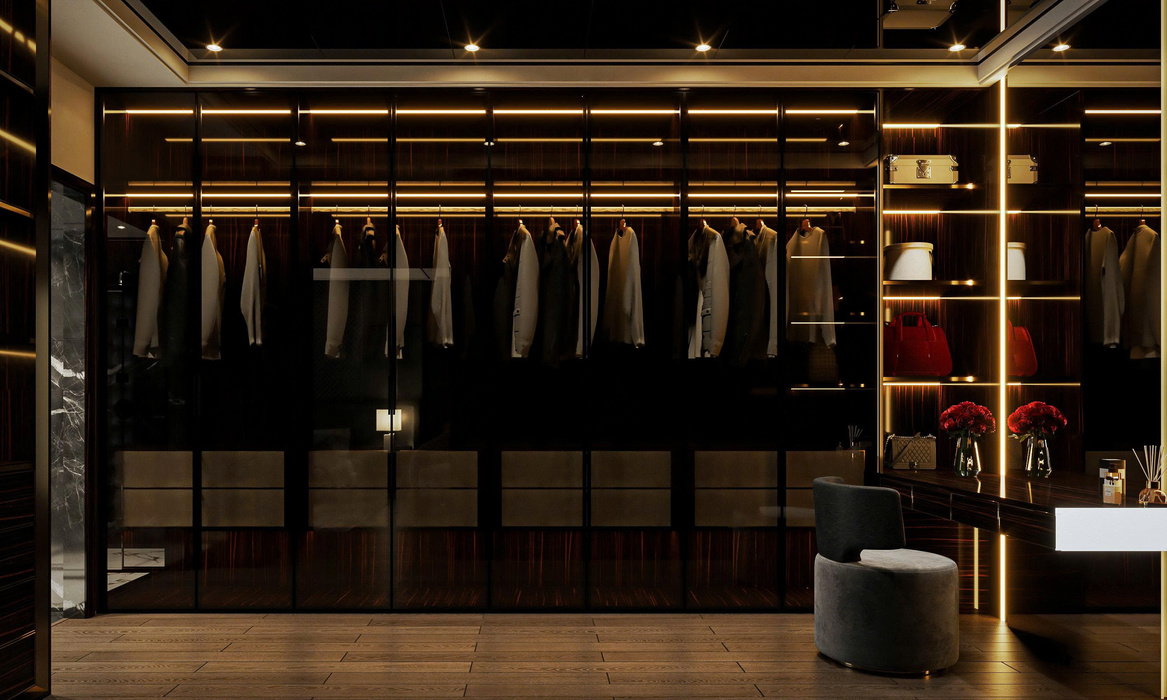 Ánh sáng nội thất: Bên trong tủ, đèn LED thanh hắt sáng được tích hợp dọc theo thanh treo và các ngăn trưng bày, giúp nhìn rõ trang phục và phụ kiện, đồng thời tạo hiệu ứng lấp lánh, tôn lên vẻ đẹp của vật liệu nội thất.
