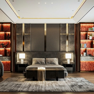 + Hai bên đầu giường là hệ kệ âm tường, sử dụng gỗ veneer vân đỏ gạch.